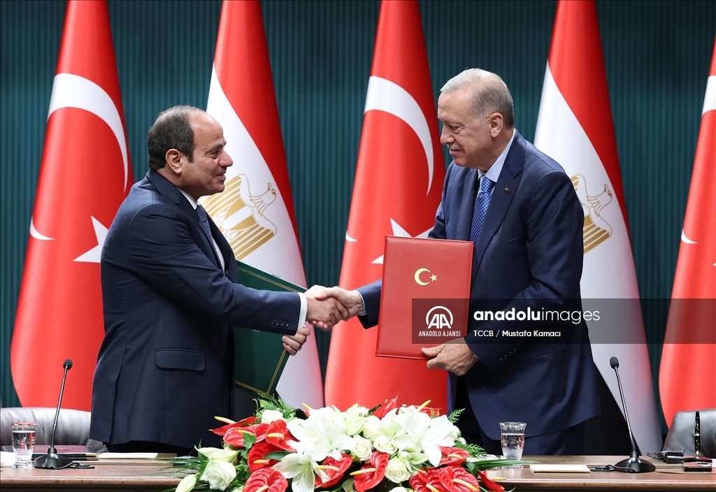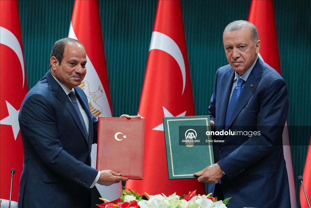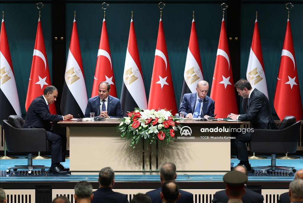 Cumhurbaşkanı Recep Tayyip Erdoğan ile Mısır Cumhurbaşkanı Abdulfettah Es-Sisi, Cumhurbaşkanlığı Külliyesi'nde Yüksek Düzeyli Stratejik İşbirliği Konseyi Toplantısı'na başkanlık etti. Toplantı sonrası, Cumhurbaşkanı Erdoğan ve Mısır Cumhurbaşkanı es-Sisi huzurunda iki ülke arasında 17 anlaşma imzalandı. (TCCB/Mustafa Kamacı - Anadolu Ajansı)TCCB / Mustafa Kamacı
