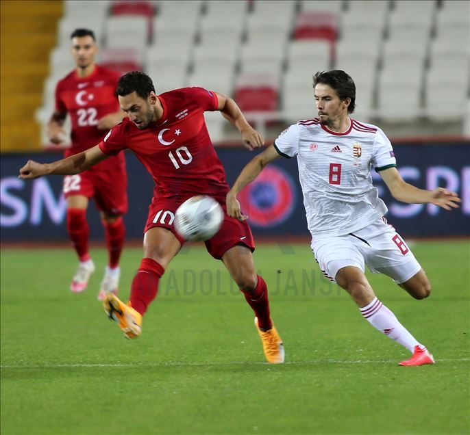 UEFA Uluslar B Ligi 3. Grup'ta Türkiye ile Macaristan, Sivas Yeni 4 Eylül Stadyumu'nda karşılaştı. Bir pozisyonda Hakan Çalhanoğlu (solda), rakibi Nagy (sağda) mücadele etti. ( Serhat Zafer - Anadolu Ajansı )Serhat Zafer
