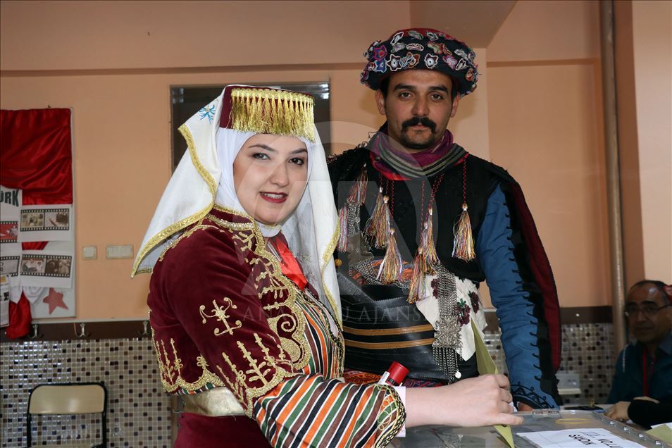 Aydın'da bir çift, 31 Mart Mahalli İdareler Genel Seçimleri için efe kıyafetleriyle sandık başına gitti. ( Ferdi Uzun - Anadolu Ajansı )Ferdi Uzun