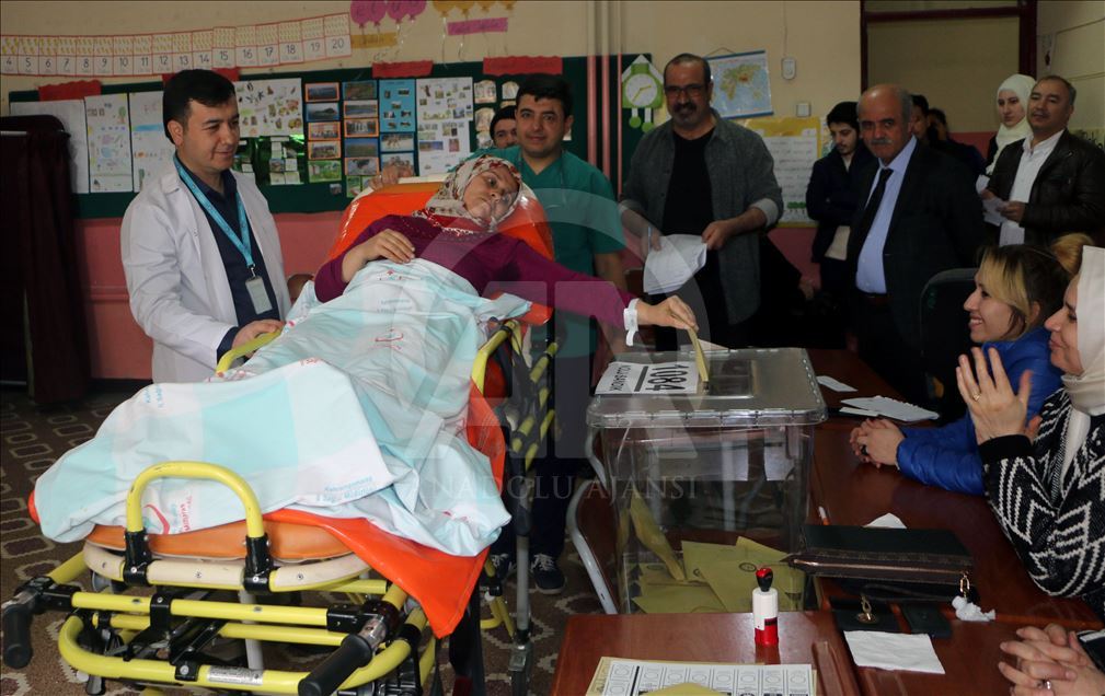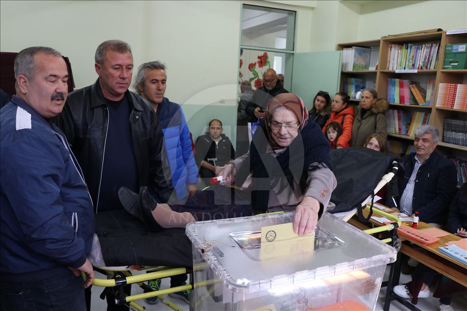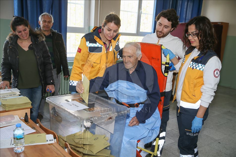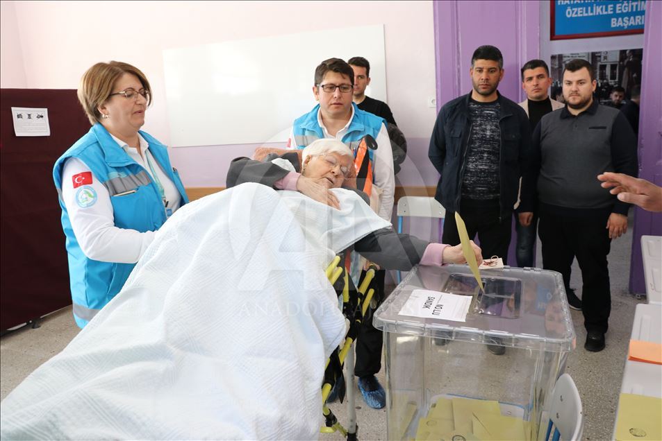 İzmir'de oy kullanmak isteyen ancak çeşitli nedenlerden dolayı evlerinden çıkamayan hasta ve yaşlılar, sandıklara ambulanslarla taşındı. Sandığa gitmek için başvuran vatandaşlardan 5 yıldır kanser tedavisi gören 78 yaşındaki Nazmi Şahin'i 112 Acil Sağlık ekipleri evinden ambulansla alarak sedyeye alarak oy kullanacağı Fatma Hikmet Kaşerci Ortaokulu'na getirdi. Okul bahçesinde seçim kurulu görevlilerince karşılanan Şahin, sağlık ekipleri ve yakınlarının taşıdığı sedyeyle oy kullanacağı okulun ikinci katındaki 1022 sandığa çıkarıldı. Oy verme işlemlerinin tamamlanmasının ardından Şahin zarfı sandığa attı. ( Emin Mengüarslan - Anadolu Ajansı )Emin Mengüarslan