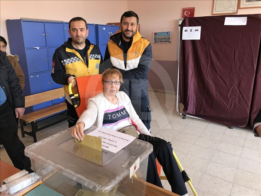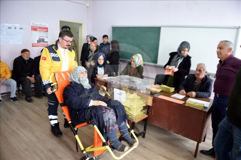 Karabük'te Vatandaşlar, 31 Mart Mahalli İdareler Genel Seçimleri için saat 08.00'den itibaren sandık başına gitti. Yürümekte güçlük çeken bazı hastalar ise 112 Acil Servis Ekipleri tarafından evlerinden alınarak oy kullanacakları sandıklara getirildi. ( Ahmet Özler - Anadolu Ajansı )Ahmet Özler