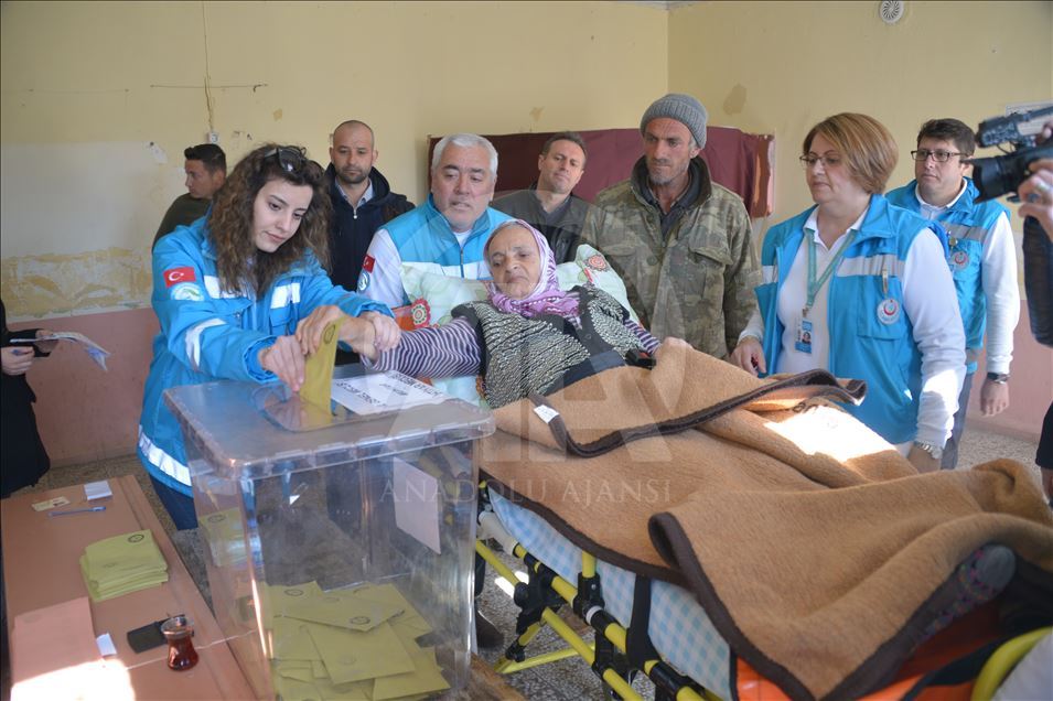 Edirne'de 90 yaşındaki Sabriye Dayıoğlu, ambulansla evinden oy kullanacağı okula götürüldü. Sağlık İl Müdürlüğüne bağlı Evde Sağlık Hizmetleri ekipleri, kentteki hastane ve evlerinden çıkamayacak durumdaki hasta ve yaşlıları, oylarını kullanabilmeleri için sandık başına götürdü. ( Cihan Demirci - Anadolu Ajansı )Cihan Demirci