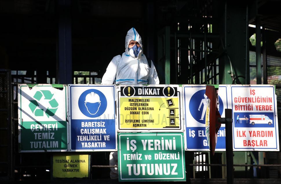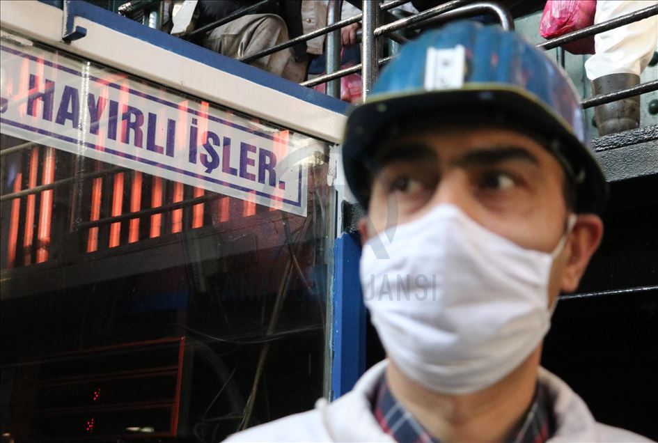 Yer altına inmek için kuyubaşındaki asansörün önüne gelen madenciler, sosyal mesafe kuralına bağlı kalınarak tek tek asansöre bindirildi. Bu arada hijyen ekiplerince asansörün yanı sıra işçilerin bulunduğu alanlar dezenfekte edildi. ( Gökhan Yılmaz - Anadolu Ajansı )Gökhan Yılmaz
