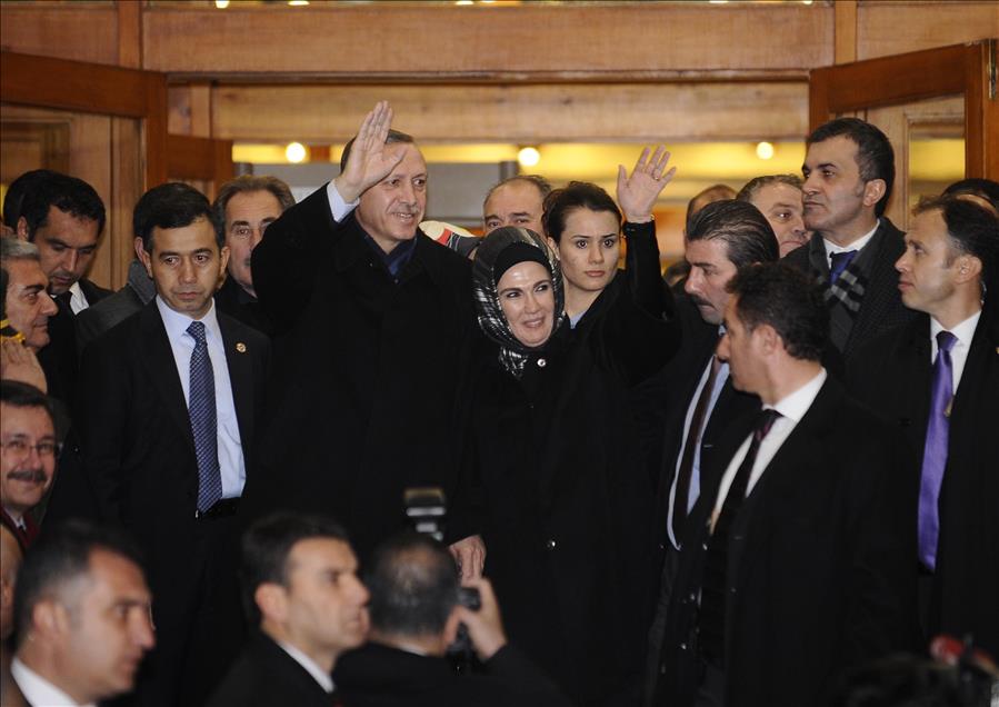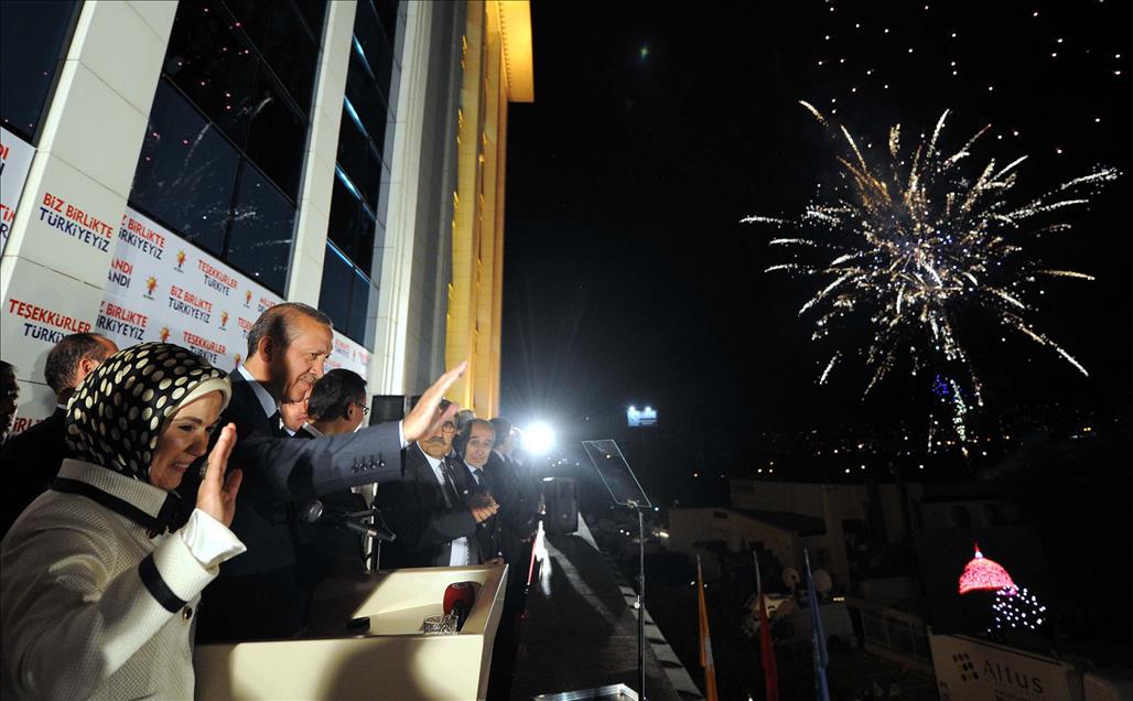 BAGIMSIZLAR ISE YUZDE 6.59 OY ALMISTI. BASBAKAN RECEP TAYYIP ERDOGAN, ESI EMINE ERDOGAN ILE BIRLIKTE AK PARTI GENEL MERKEZI'NIN BALKONUNDAN VATANDASLARA HITAP ETMISTI. (ANADOLU AJANSI - KAYHAN OZER) (ARSIV) (20111221)KAYHAN OZER
