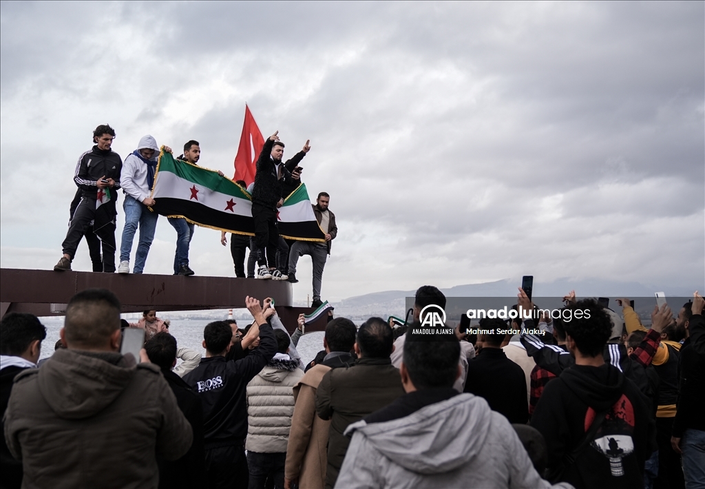 Suriye'deki 61 yıllık Baas rejiminin devrilmesinin ardından İzmir'de yaşayan Suriyeliler, sevinç gösterileri yaptı. Konak İskelesi önünde toplanan Suriyeliler, Türk ve Suriye bayrakları ile rejimin çöküşünü kutladı. ( Mahmut Serdar Alakuş - Anadolu Ajansı )Mahmut Serdar Alakuş