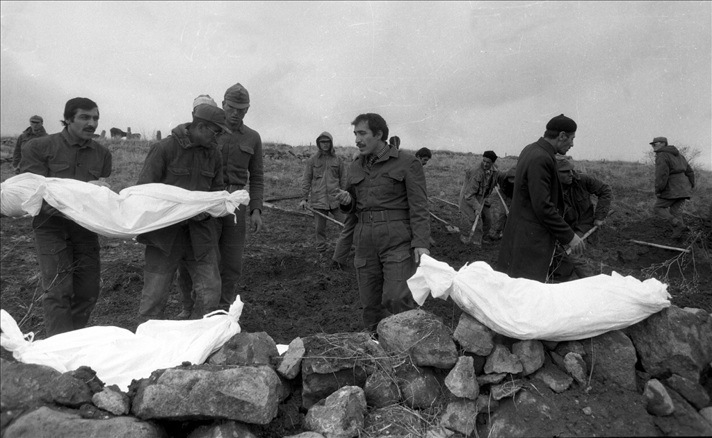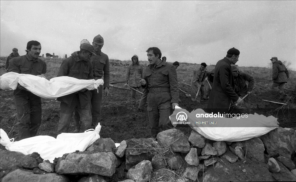 Erzurum ve çevresinde 30 Ekim 1983'te meydana gelen 6,8 şiddetindeki depremde 1151 kişi hayatını kaybetti, 500 kişi yaralandı. Depremde hayatını kaybedenler toprağa verilirken. (Arşiv) ( MEHMET UNLU - Anadolu Ajansı )MEHMET UNLU