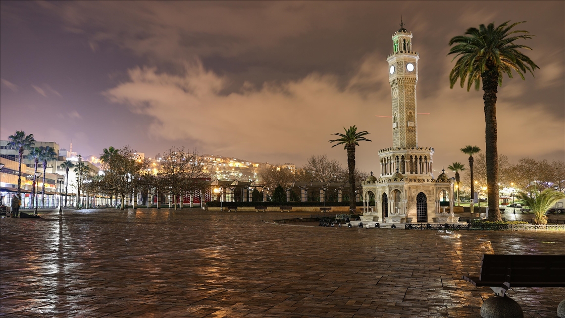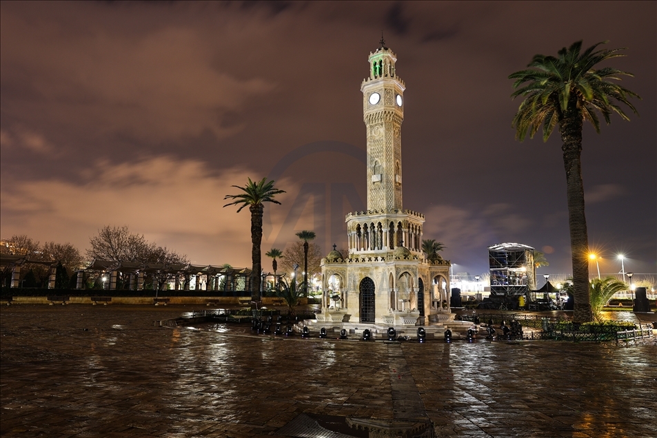 Yeni tip koronavirüs (Kovid-19) salgınıyla mücadele kapsamında Türkiye genelinde 4 Ocak Pazartesi günü saat 05.00'te sona erecek sokağa çıkma kısıtlaması saat 21.00 itibarıyla başladı. İzmir’de kısıtlamanın başlamasının ardından cadde ve sokaklar sessizliğe büründü. Tarihi Saat Kulesi'nin de bulunduğu Konak Meydanı ile çevresindeki Mustafa Kemal Sahil Bulvarı’nın sokağa çıkma kısıtlaması nedeniyle boş kaldığı görüldü. ( Mehmet Emin Mengüarslan - Anadolu Ajansı )Mehmet Emin Mengüarslan