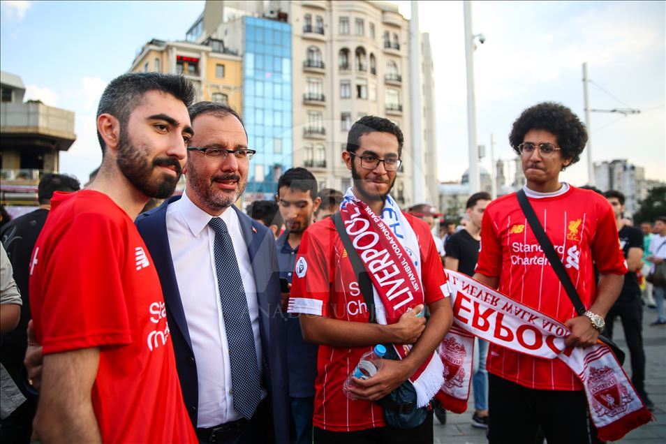 Gençlik ve Spor Bakanı Mehmet Muharrem Kasapoğlu (sol 2), İngiltere takımları Liverpool ve Chelsea arasında oynanacak UEFA Süper Kupa final maçı öncesinde Taksim Meydanı'nda toplanan Liverpool taraftarlarıyla fotoğraf çekildi. ( Muhammed Enes Yıldırım - Anadolu Ajansı )Muhammed Enes Yıldırım