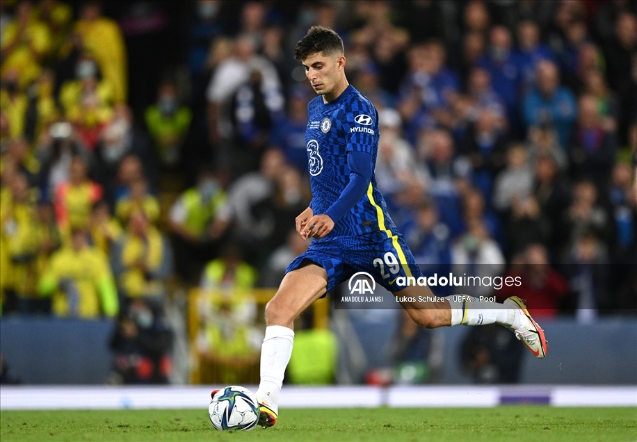 46. UEFA Süper Kupa maçında Chelsea ile Villarreal takımları Kuzey İrlanda'nın başkenti Belfast'taki Windsor Park'ta karşılaştı. Bir pozisyonda Chelsea oyuncusu Kai Havertz penaltı kullandı. ( Lukas Schulze - UEFA / Pool - Anadolu Ajansı )Lukas Schulze - UEFA / Pool
