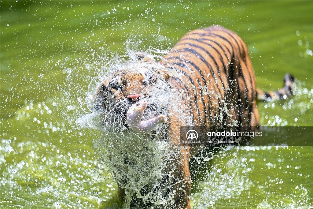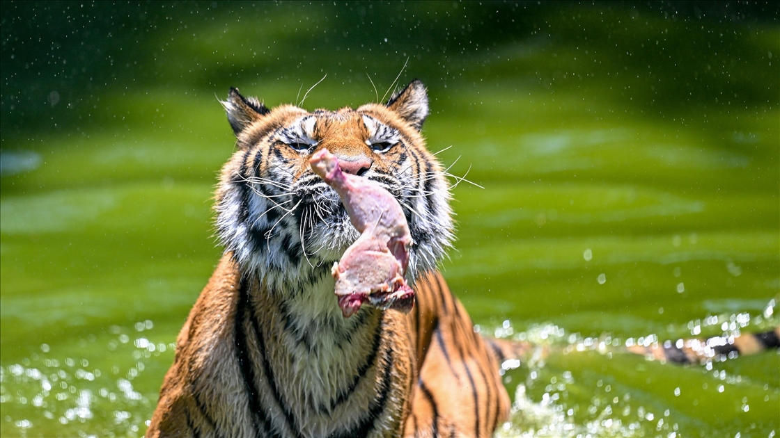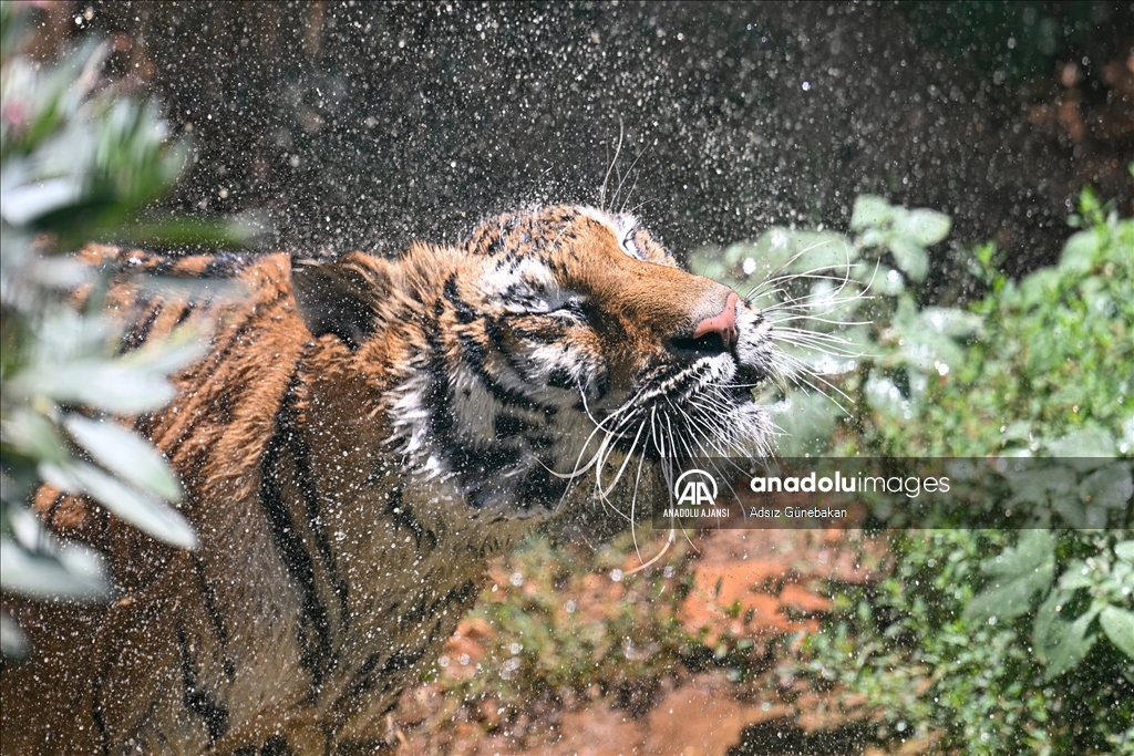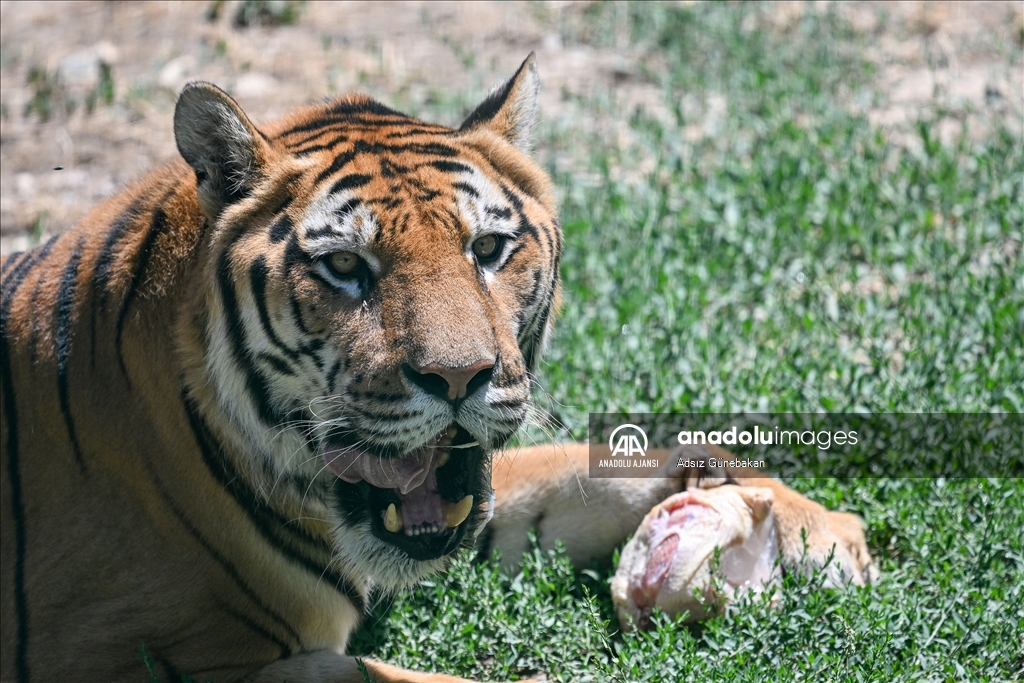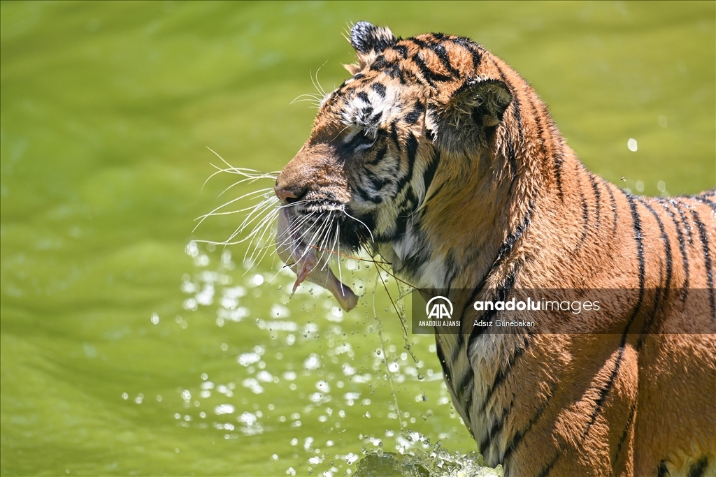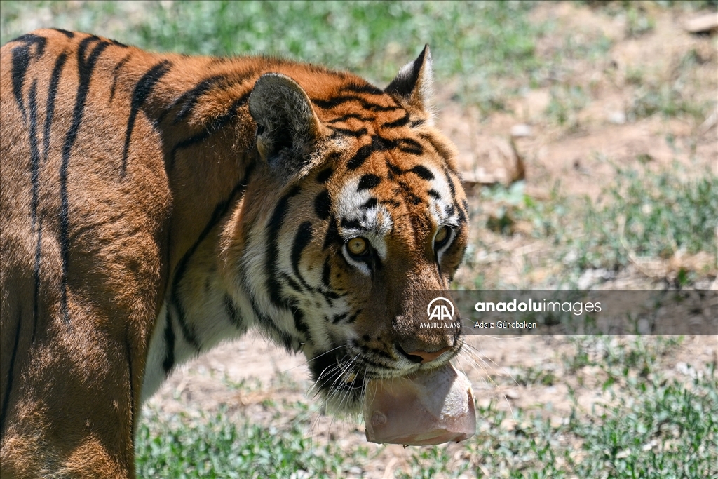 Alanlarında vakit geçiren kaplanlar, hava sıcaklıklarının yüksek olması nedeniyle kendileri için hazırlanan buzlu kokteyllerle serinleme fırsatı buluyor.Adsız Günebakan