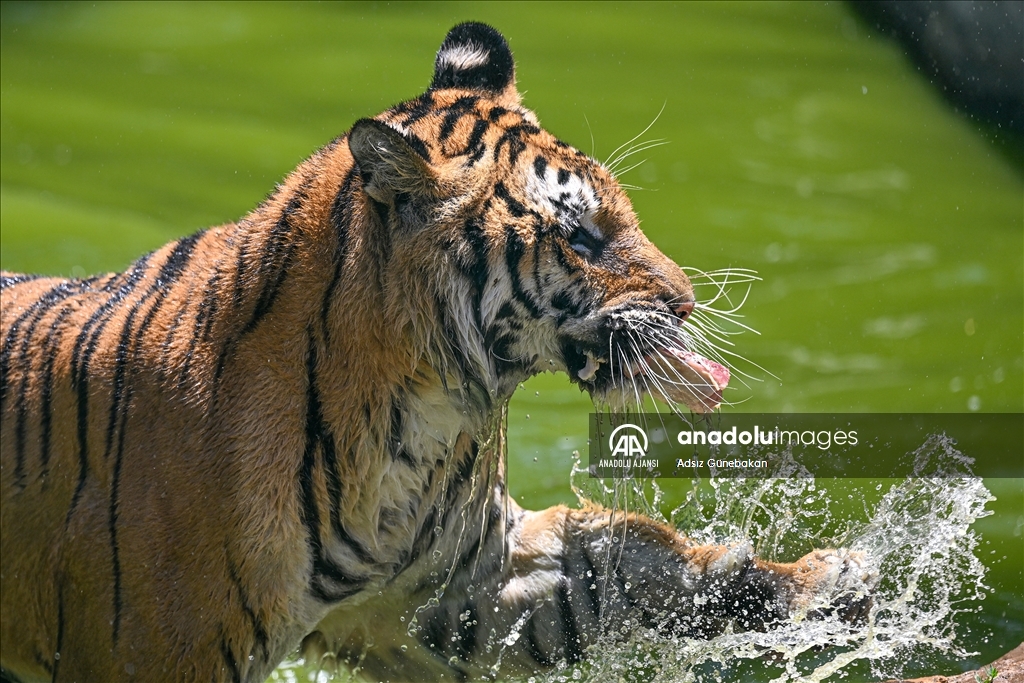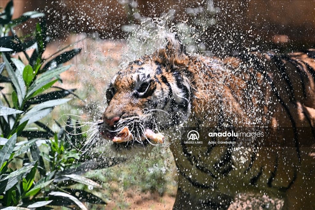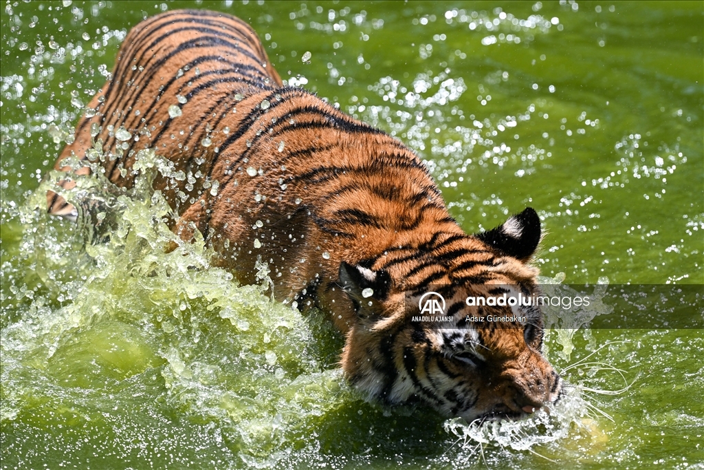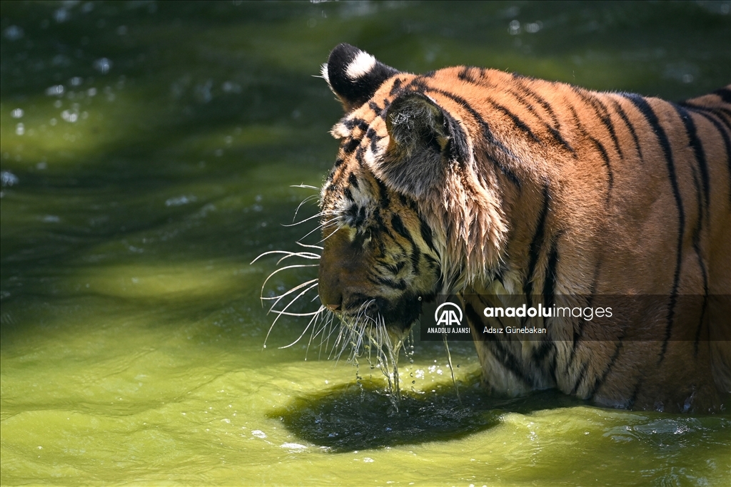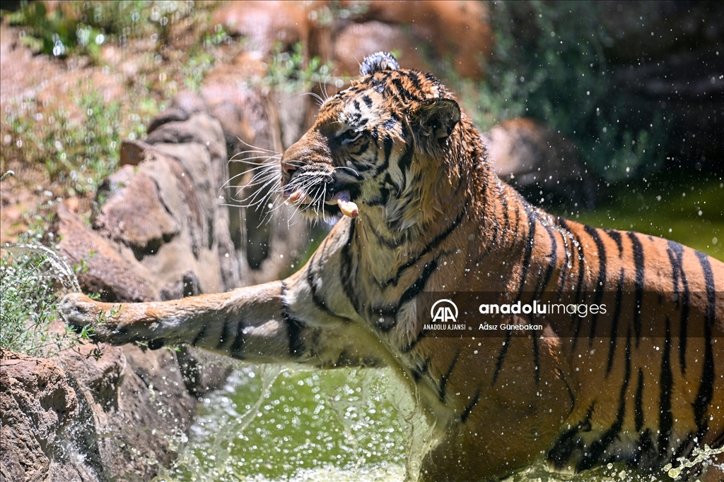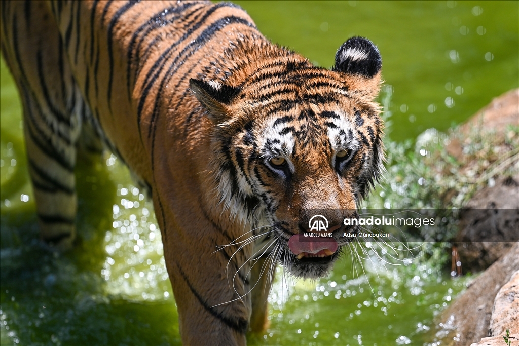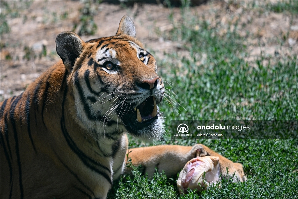 Alanlarında vakit geçiren kaplanlar, hava sıcaklıklarının yüksek olması nedeniyle kendileri için hazırlanan buzlu kokteyllerle serinleme fırsatı buluyor.Adsız Günebakan
