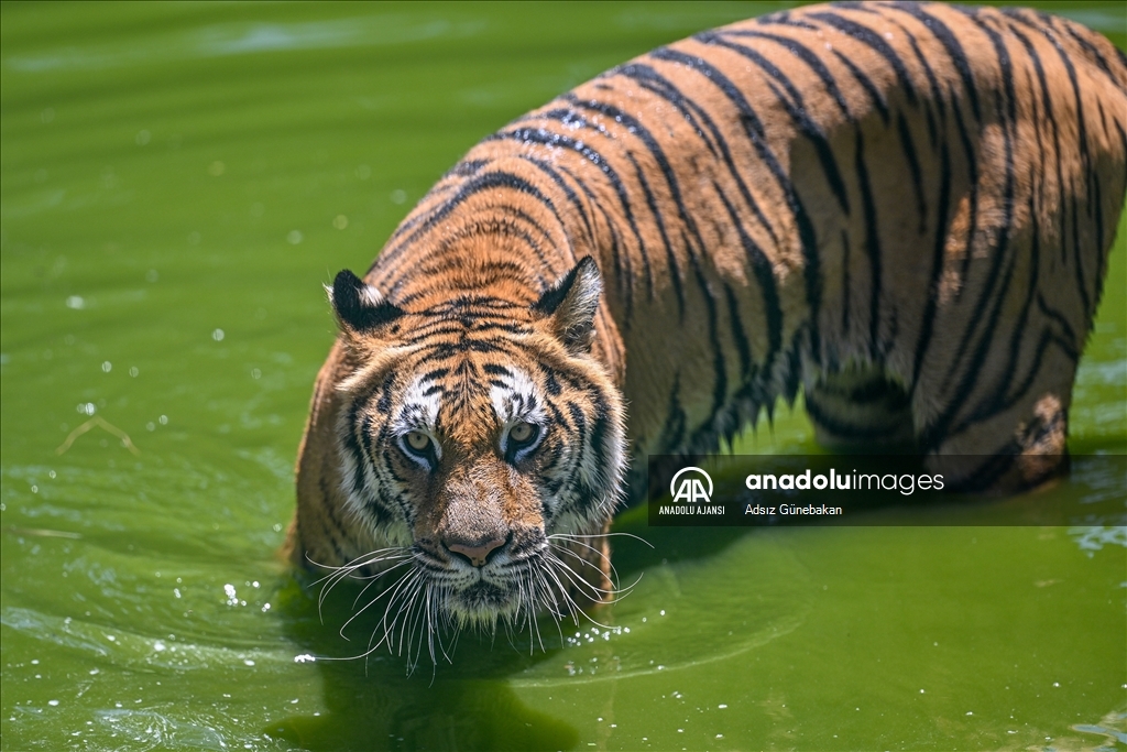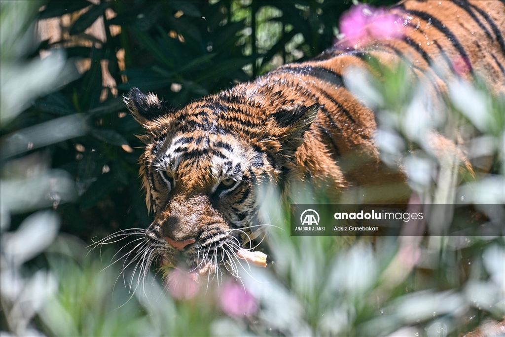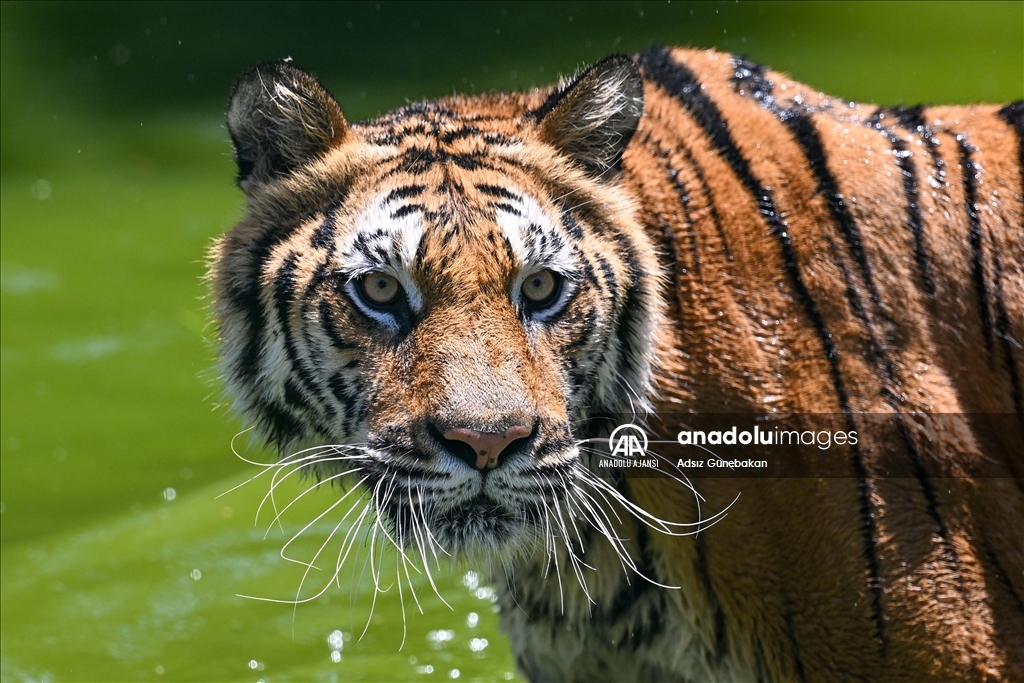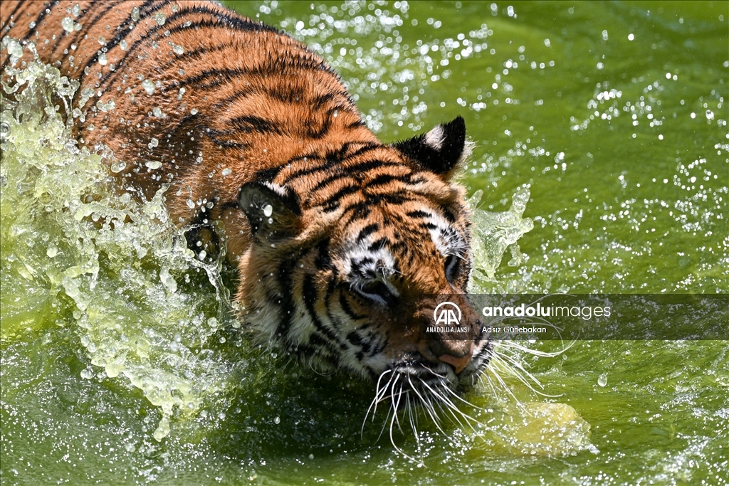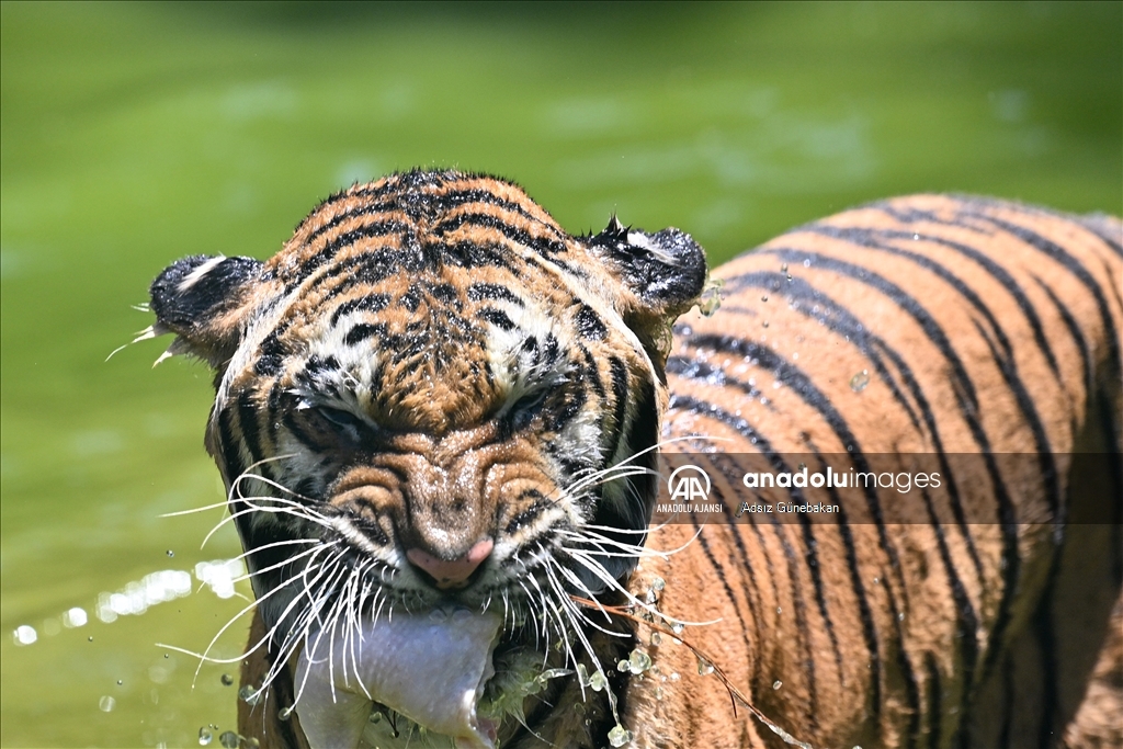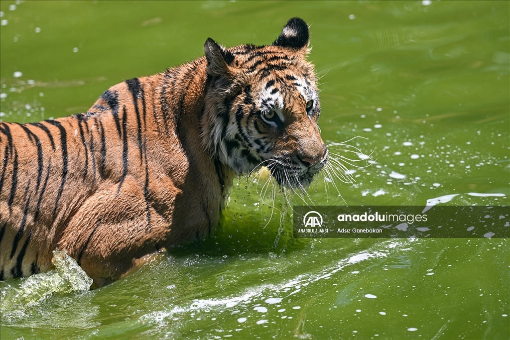 Alanlarında vakit geçiren kaplanlar, hava sıcaklıklarının yüksek olması nedeniyle kendileri için hazırlanan buzlu kokteyllerle serinleme fırsatı buluyor.Adsız Günebakan