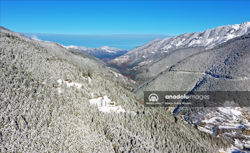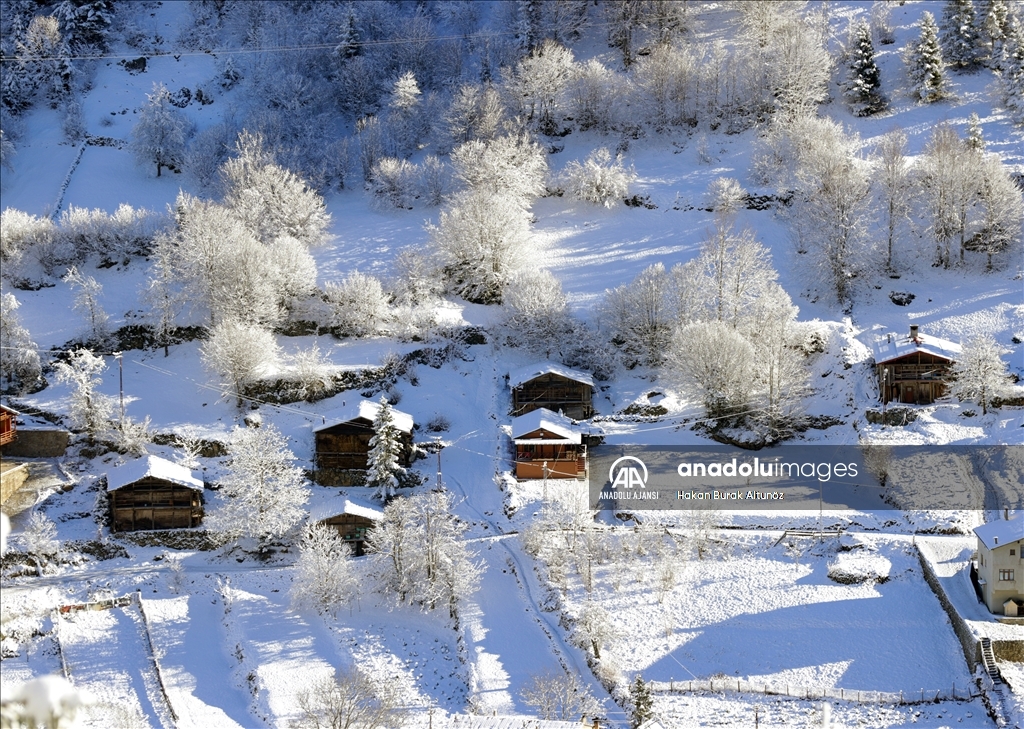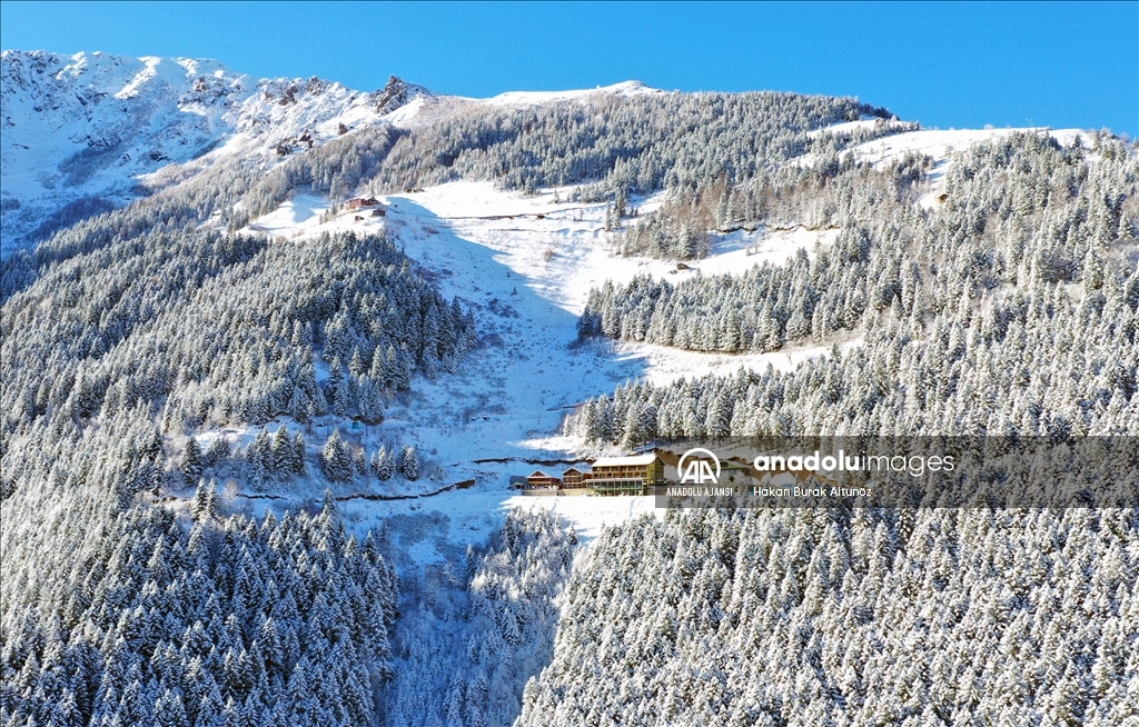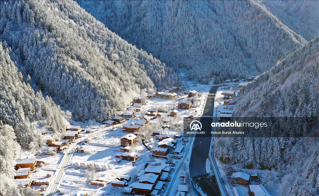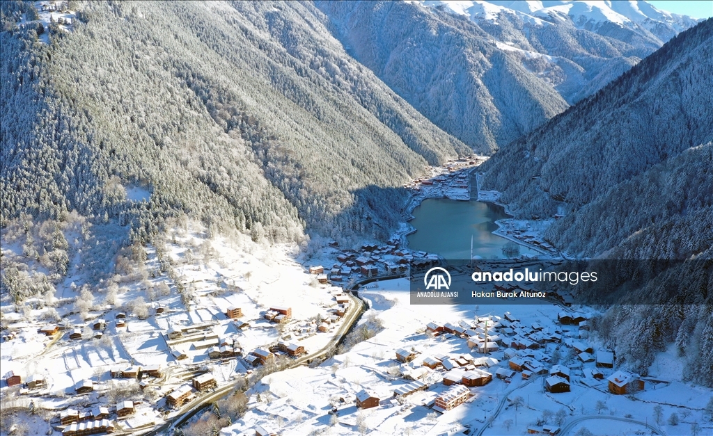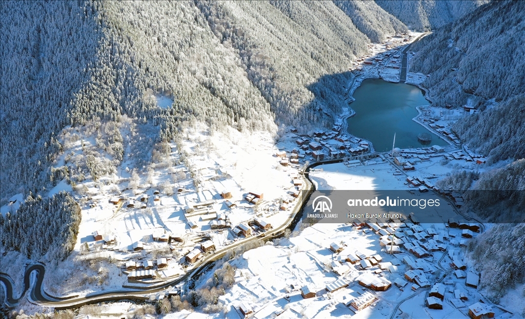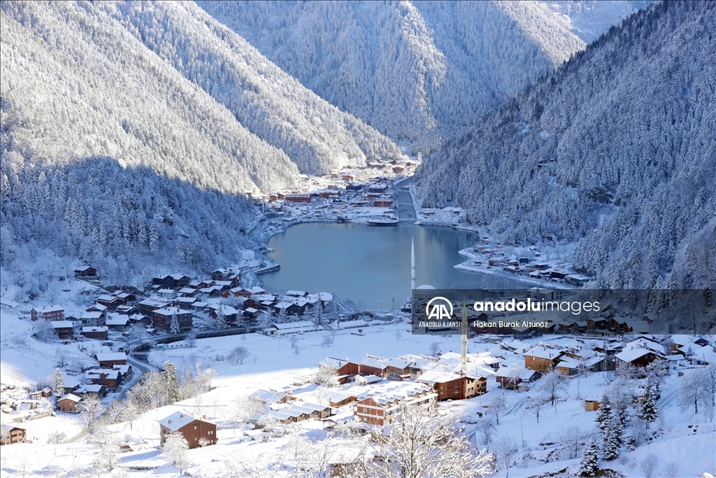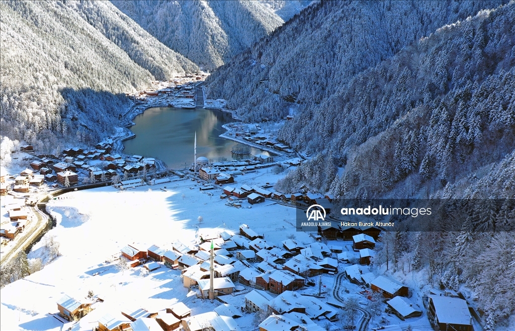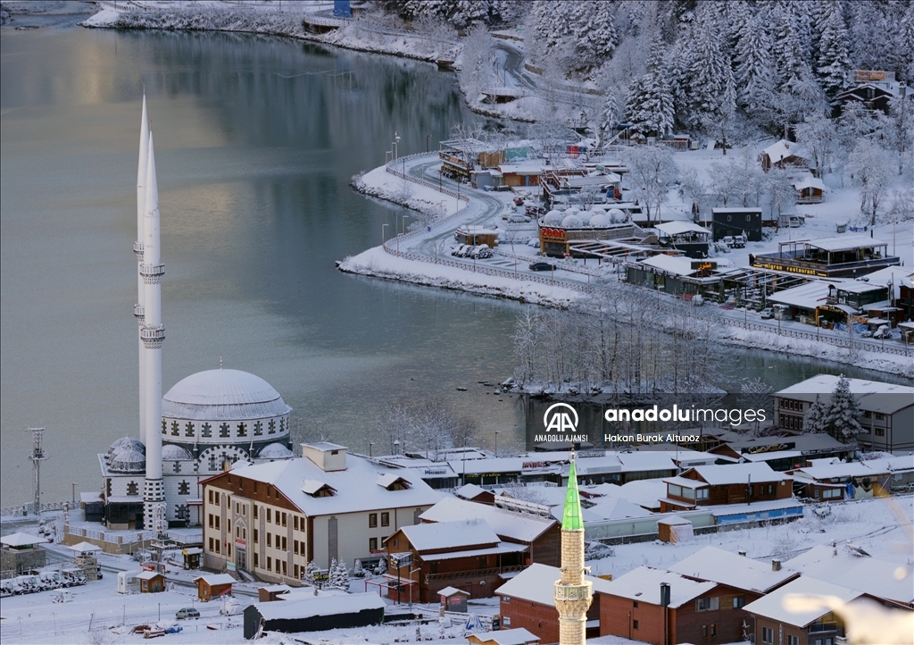 Türkiye'nin önemli turizm merkezlerinden Trabzon'un Çaykara ilçesindeki Uzungöl, kar yağışı sonrası beyaz örtüyle kaplandı.