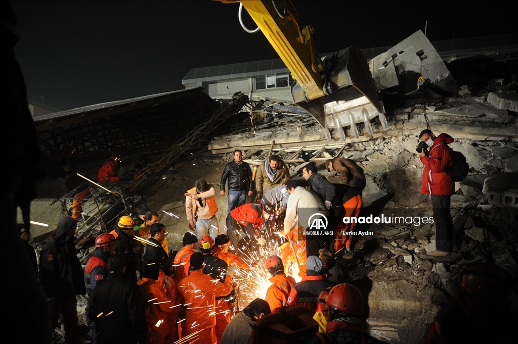 Van, 11 yıl önce meydana gelen 7,2 ve 5,6 büyüklüğündeki iki depremle ağır yara almasının ardından, kent için tek yürek olan vatandaşların yurdun dört bir yanından gönderdiği yardımlar ve devletin yatırımlarıyla yeniden ayağa kaldırıldı. Depremle yıkılan Bayram Oteli'nin enkazında kurtarma çalışmaları devam etmişti. (Arşiv) ( Evrim Aydın - Anadolu Ajansı )Evrim Aydın