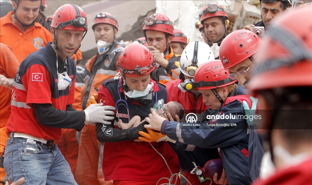Van, 11 yıl önce meydana gelen 7,2 ve 5,6 büyüklüğündeki iki depremle ağır yara almasının ardından, kent için tek yürek olan vatandaşların yurdun dört bir yanından gönderdiği yardımlar ve devletin yatırımlarıyla yeniden ayağa kaldırıldı. Van'ın Erciş ilçesindeki depremden 2 gün sonra, 25 Ekim 2011'de enkaz altından 14 günlük Azra Karaduman adlı bebek, yaralı olarak çıkarılmıştı. (Arşiv) ( Tolga Bozoğlu/EPA - Anadolu Ajansı )Tolga Bozoğlu/EPA