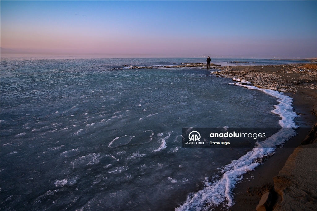 Dünyanın en büyük sodalı gölü olan Van Gölü'nün yüzeyi, soğuk havanın etkisiyle yer yer buz parçacıklarıyla kaplandı. Özkan Bilgin