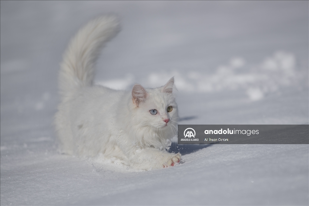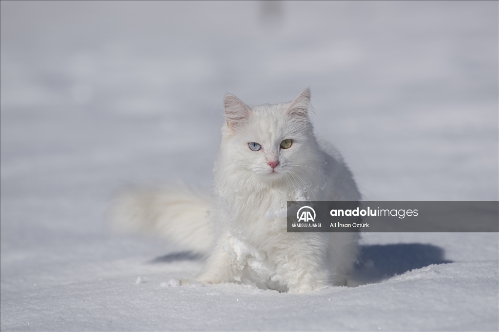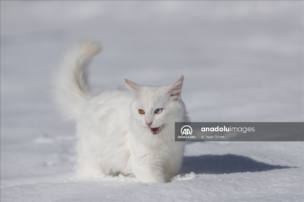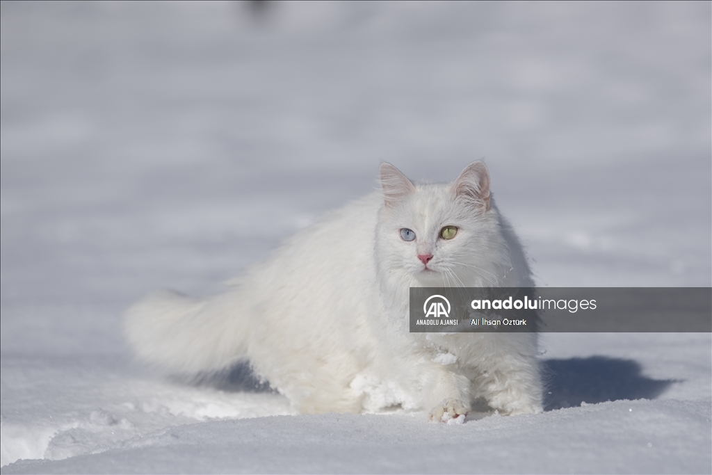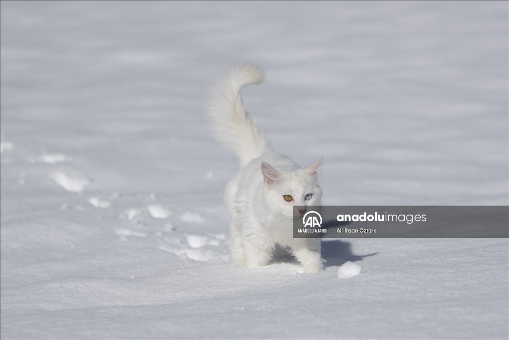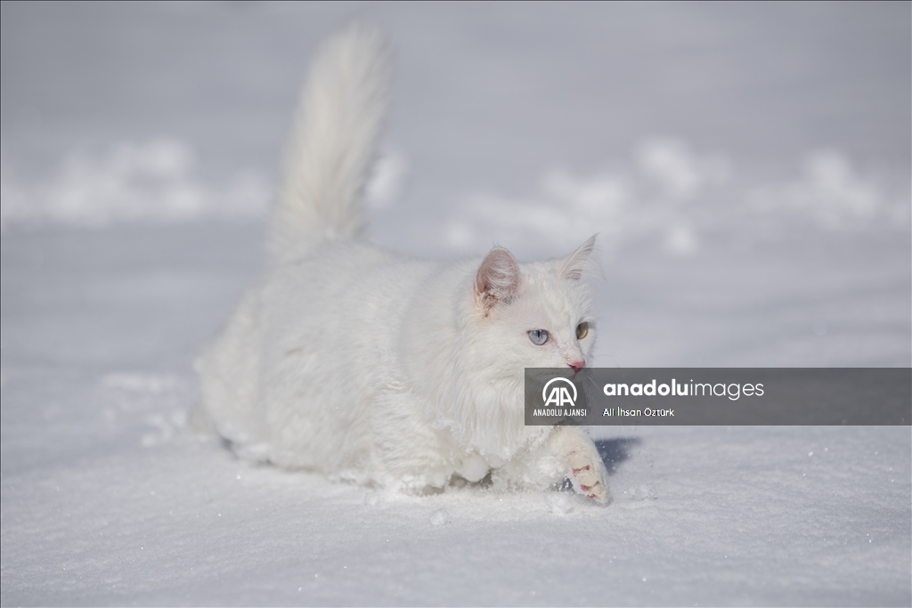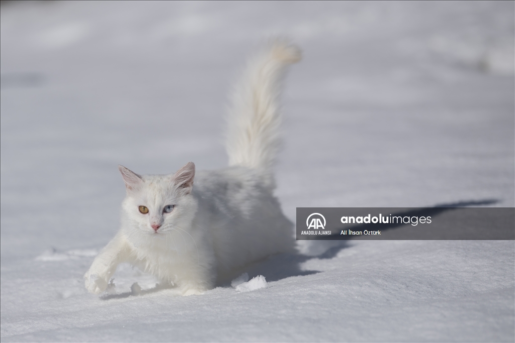 Van'da etkili olan kar yağışının ardından kent beyaza büründü. Yüzüncü Yıl Üniversitesi bünyesinde hizmet veren Van Kedisi Araştırma ve Rehabilitasyon Merkezi'ndeki kedi villasında koruma altında tutulan Van Kedileri, beyaz örtü üzerinde dolaşarak karın tadını çıkardı.