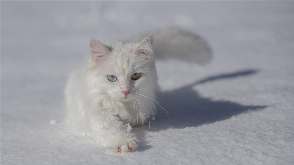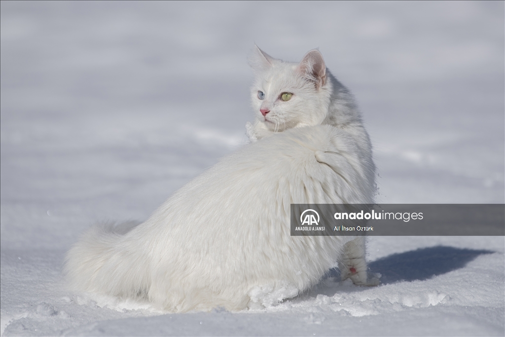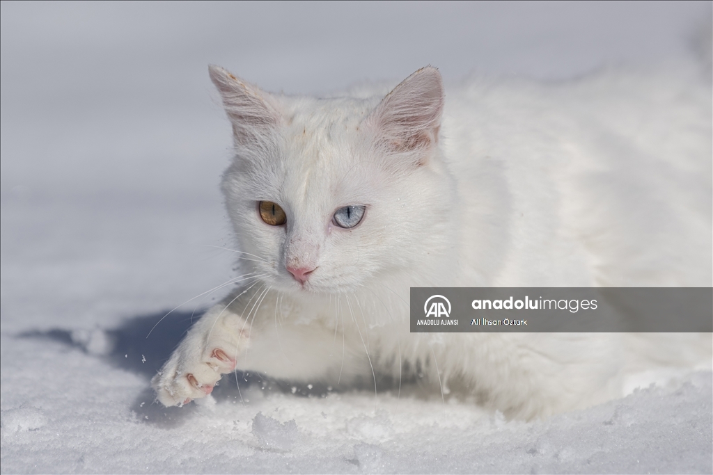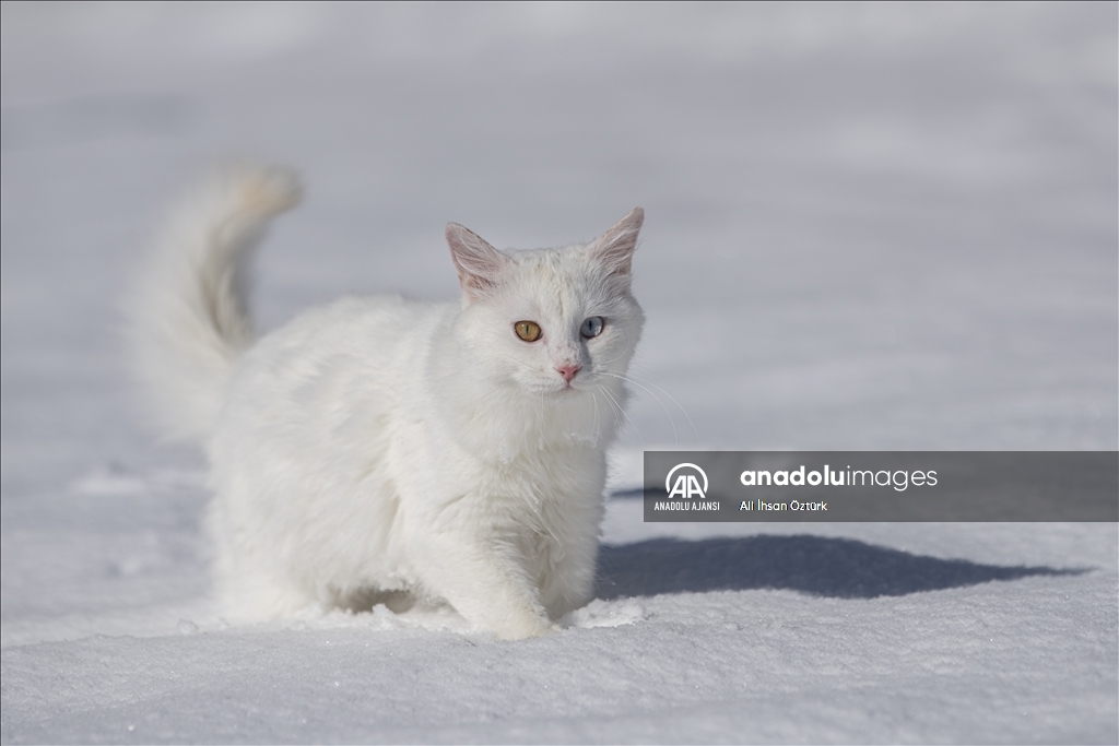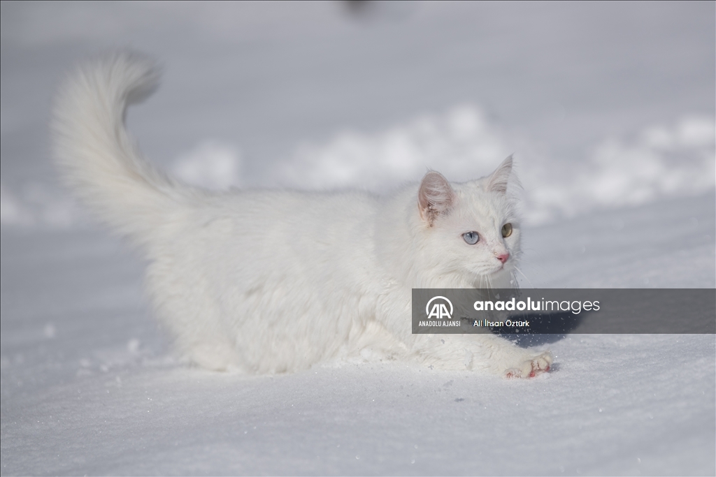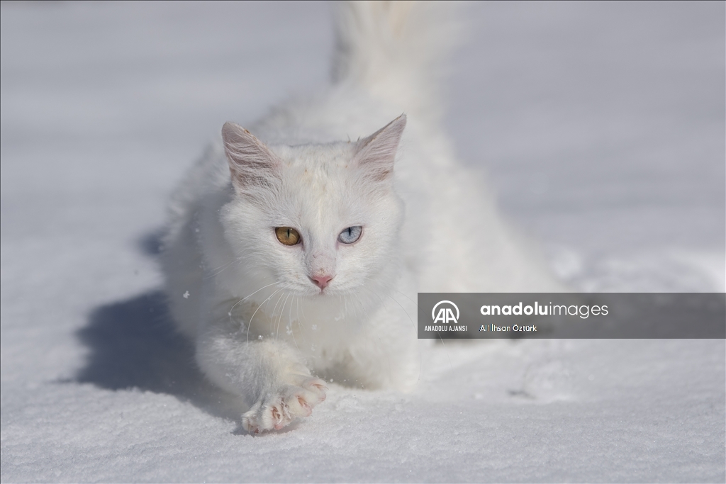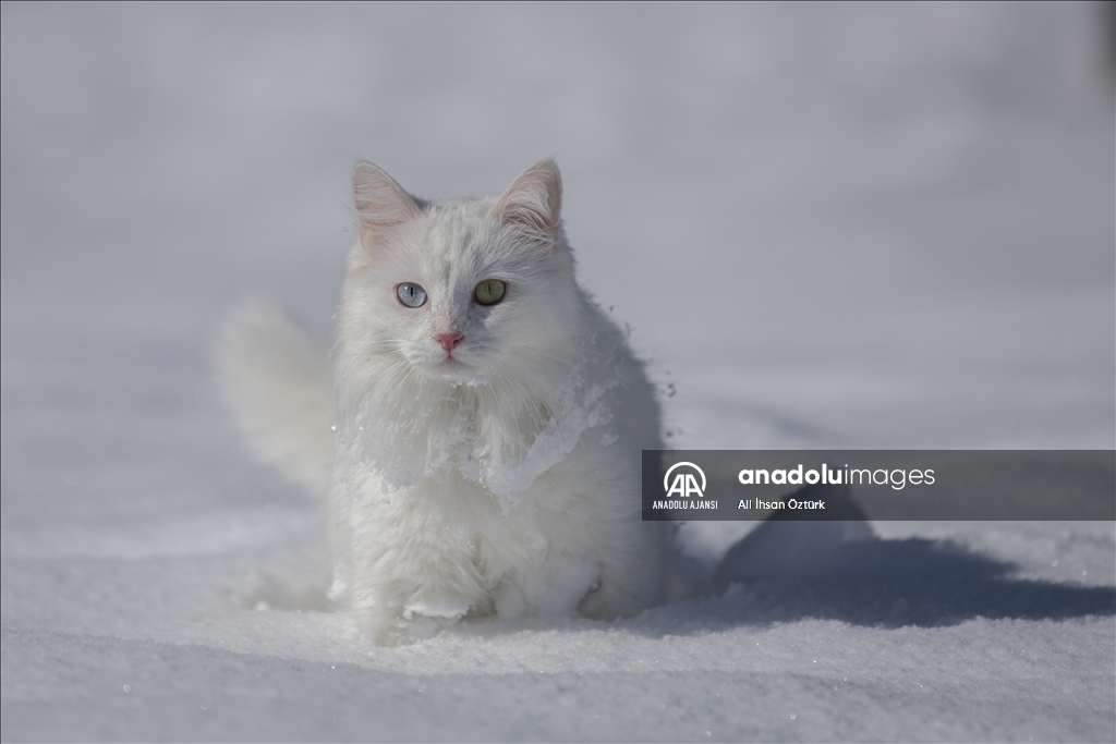 Van'da etkili olan kar yağışının ardından kent beyaza büründü. Yüzüncü Yıl Üniversitesi bünyesinde hizmet veren Van Kedisi Araştırma ve Rehabilitasyon Merkezi'ndeki kedi villasında koruma altında tutulan Van Kedileri, beyaz örtü üzerinde dolaşarak karın tadını çıkardı.