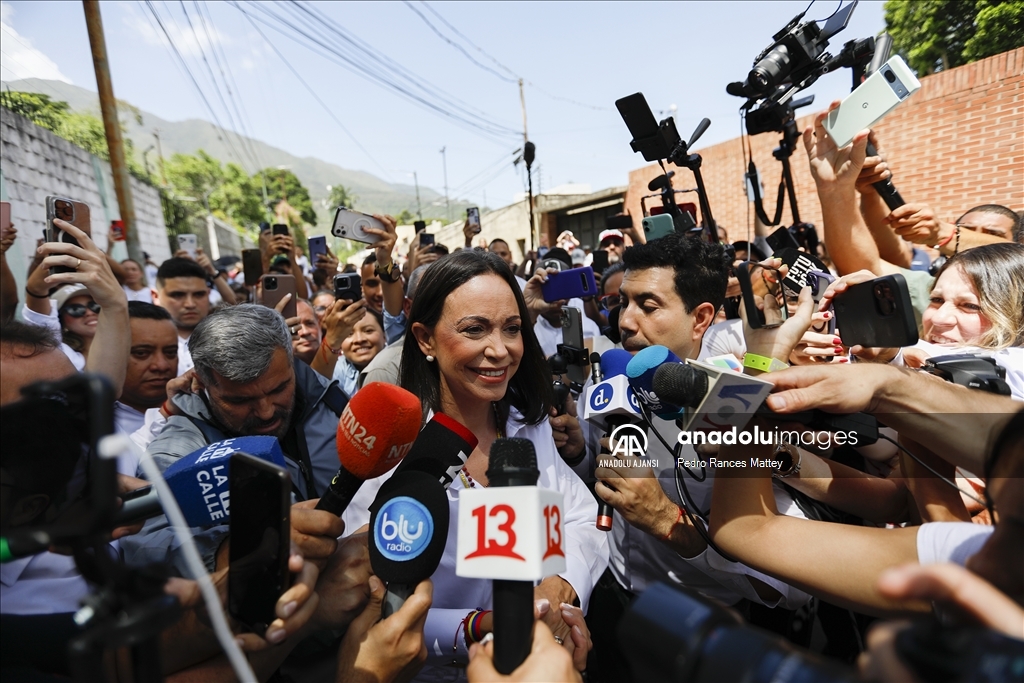 Venezuela muhalefet lideri Maria Corina Machado, Caracas'ta oyunu kullandıktan sonra basına konuştu.Pedro Rances Mattey