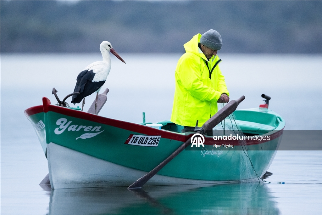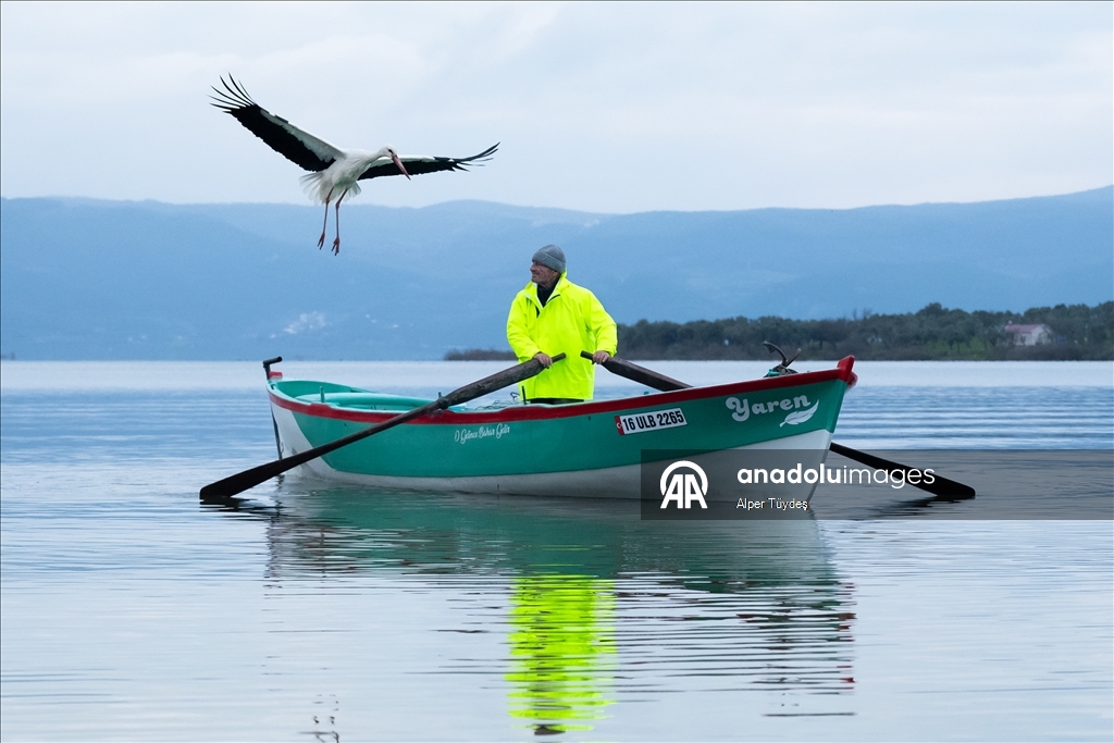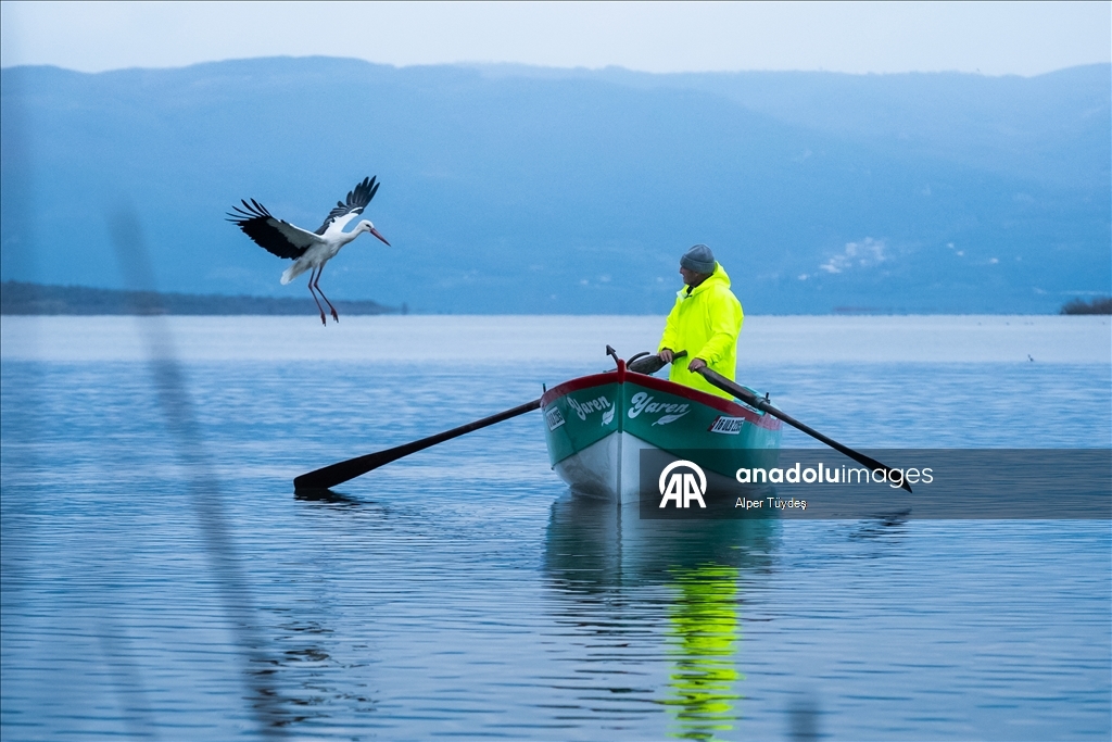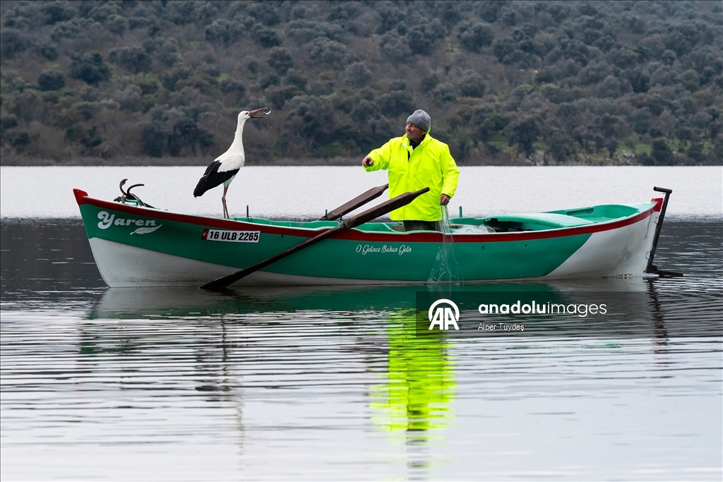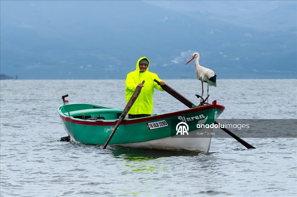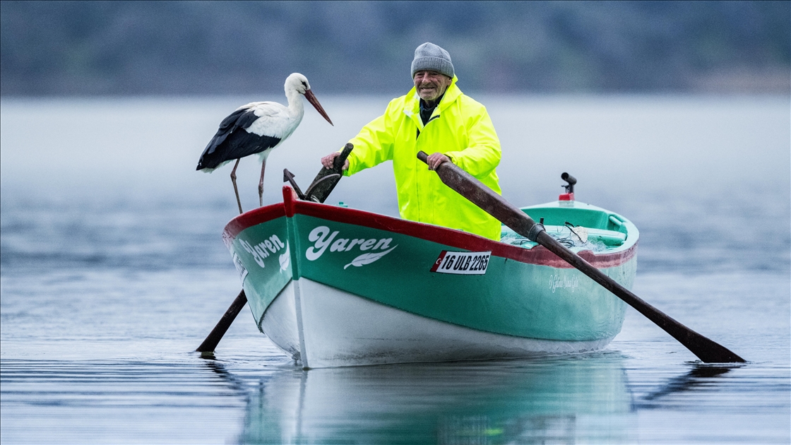 Eskikaraağaç Leylek Köyü'ndeki Balıkçı Adem Yılmaz’ın kayığına konan Yaren Leylek’in gelenekselleşmiş fotoğrafları Yaban Hayatı Fotoğrafçısı Alper Tüydeş tarafından çekildi. (Alper Tüydeş - Anadolu Ajansı)Alper Tüydeş