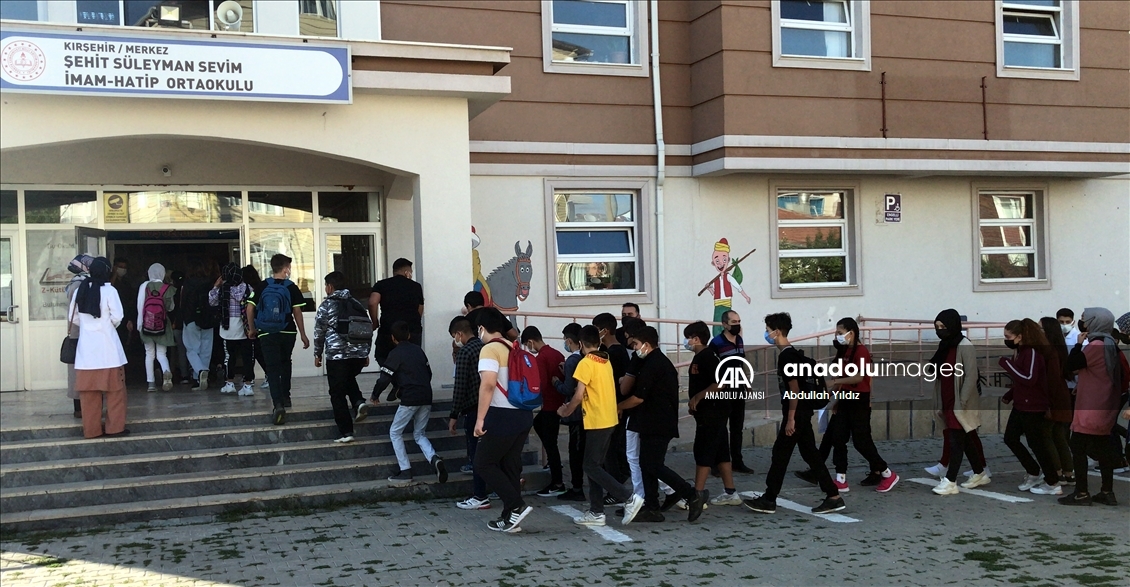 Kırşehir'de, yeni tip koronavirüs (Kovid-19) tedbirleri alınarak hazırlıkların tamamlandığı okullarda tüm kademelerde yüz yüze eğitime başlandı. Merkez Gazi ve Şehit Süleyman Sevim İmam Hatip ortaokullarının bahçesinde sabah saatlerinde tören düzenlendi. ( Abdullah Yıldız - Anadolu Ajansı )Abdullah Yıldız