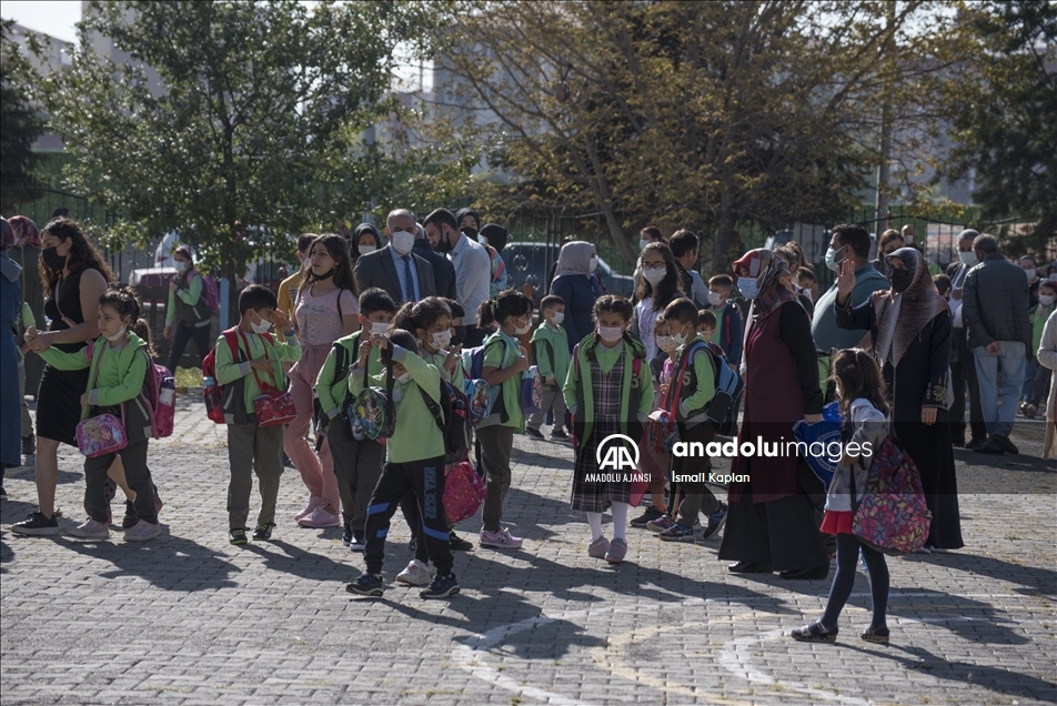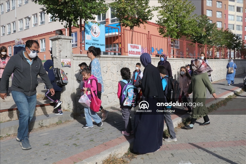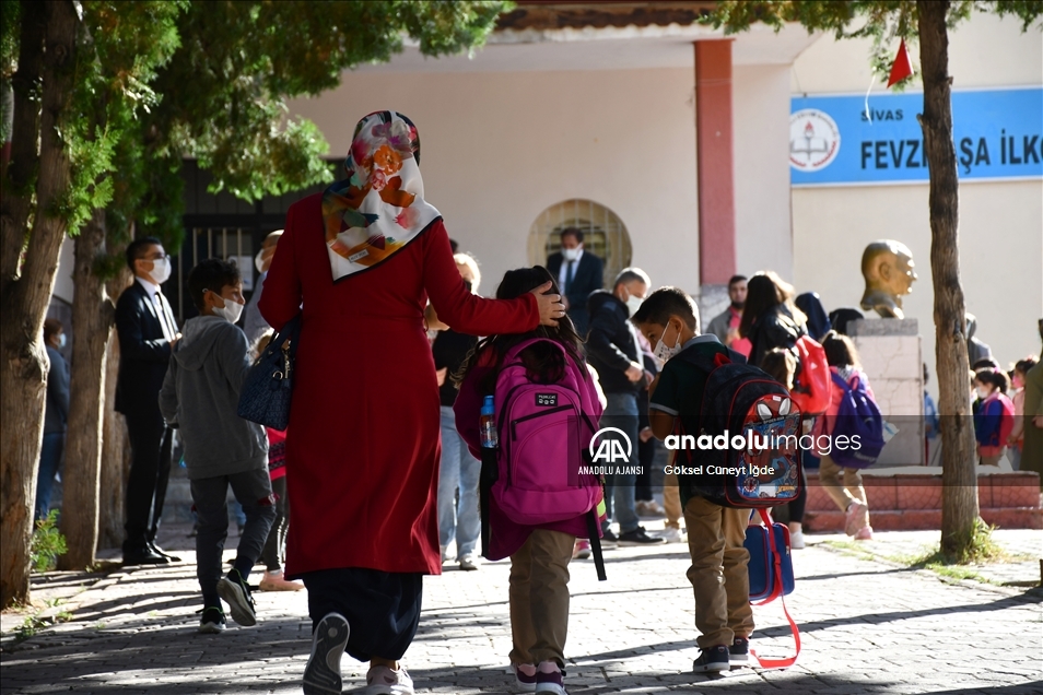 Türkiye genelinde Kovid-19 tedbirleri alınarak tüm hazırlıkların tamamlandığı okullarda bugünden itibaren haftada 5 gün yüz yüze eğitime başlandı. Sivas'ta da aileler, sabahın erken saatlerinde itibaren çocuklarıyla birlikte okul yolunu tuttu. Öğrenciler, ilk ders zilinin çalmasıyla salgın kuralları çerçevesinde sınıflara alındı. ( Göksel Cüneyt İğde - Anadolu Ajansı )Göksel Cüneyt İğde