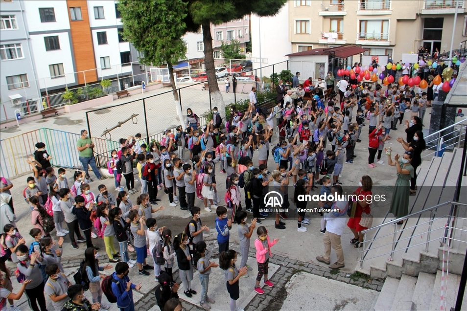 Yeni eğitim öğretim yılının başlamasıyla öğrenciler okullarına gelerek ders başı yaptı. Tekirdağ'da da öğrenciler koronavirüs önlemlerine uyarak okula geldi. ( Mesut Karaduman - Anadolu Ajansı )Mesut Karaduman