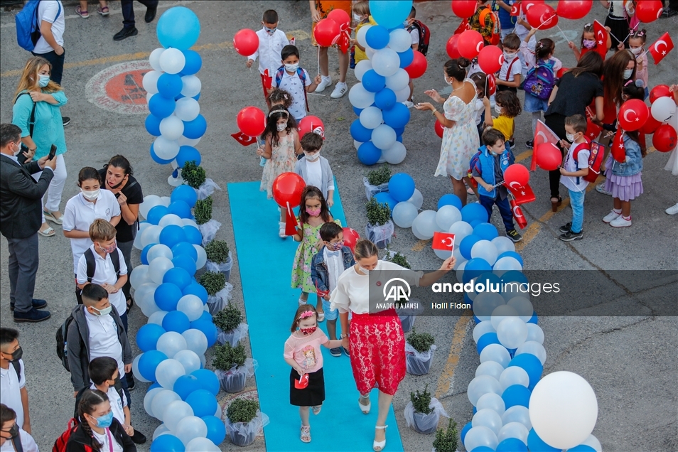 İzmir'de, yüz yüze eğitime başlayan öğrenciler, öğretmenleri tarafından okulun girişine serilen halı ve alkışlarla karşılandı. Balonlarla donatılan Bornova ilçesindeki Hilal Necmiye Hüsnü Atabek Ortaokulunda eğitim gören öğrenciler ise protokol halısı, konfeti ve öğretmenlerinin alkışlarıyla karşılandı. ( Halil Fidan - Anadolu Ajansı )Halil Fidan