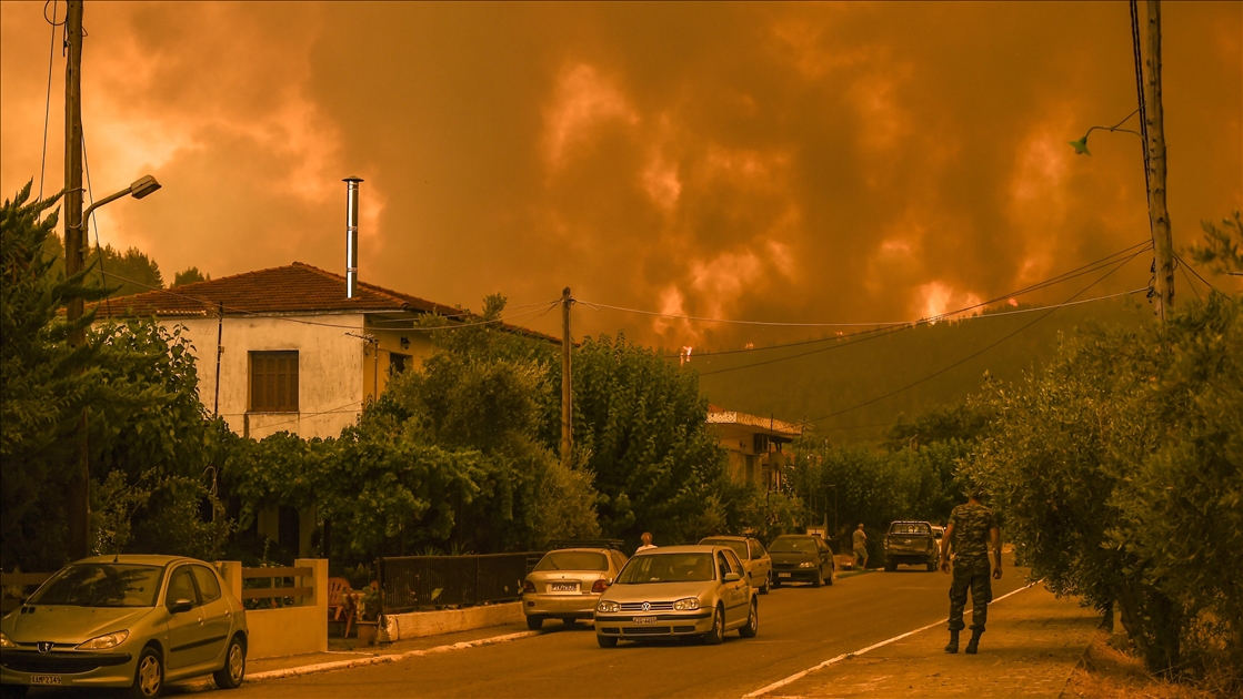 Yunanistan’da birçok noktada 10 gündür devam eden orman yangınlarının büyük bölümü tüm çabalara rağmen kontrol altına alınamıyor. Eğriboz ve Mora’da kontrol altına alınamayan yangılar nedeniyle yüzlerce köy ve yerleşim birimi boşaltıldı, enerji nakil hatlarındaki hasar nedeniyle elektrik verilemeyen birçok bölgede iletişim sorunları yaşandı. Yangınlar Gouves köyünü de sardı. ( Dimitris Lampropoulos - Anadolu Ajansı )Dimitris Lampropoulos