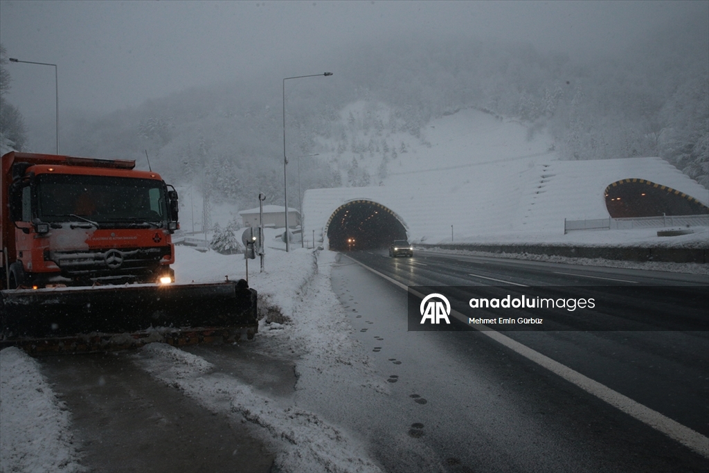 Anadolu Otoyolu ve D-100 kara yolunun Bolu Dağı kesiminde kar yağışı etkili oluyor. Kara yolları ekiplerinin karla mücadele çalışması sürüyor. (Mehmet Emin Gürbüz - Anadolu Ajansı)Mehmet Emin Gürbüz