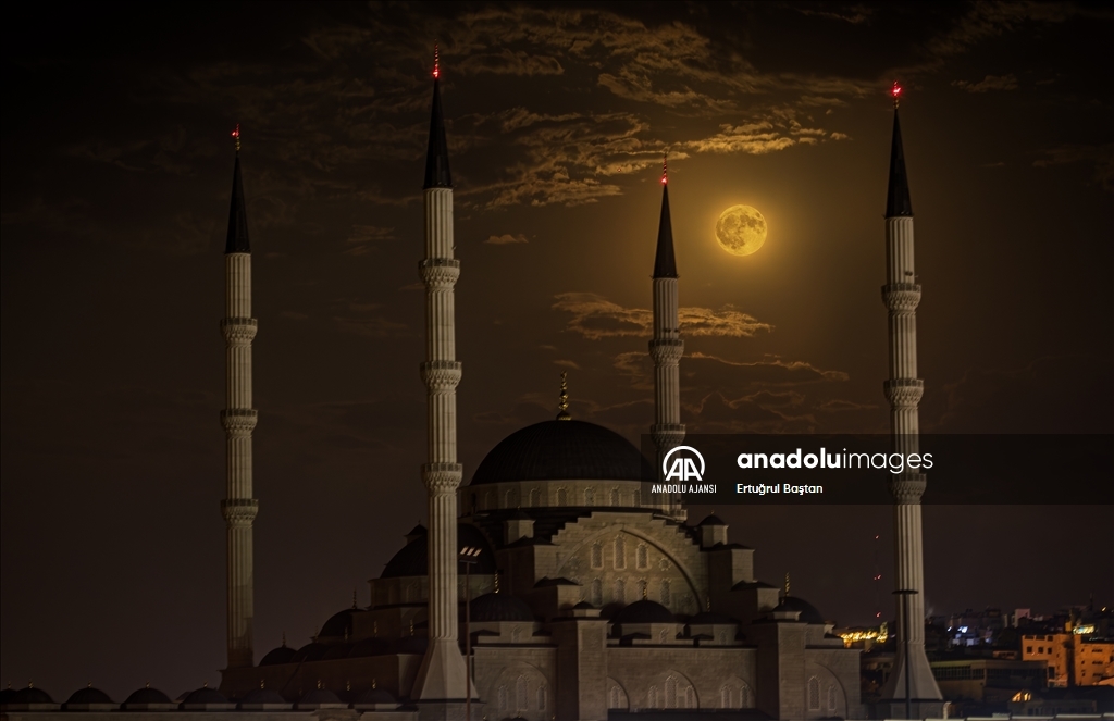 Trabzon'un Ortahisar ilçesinde akşam saatlerinde gökyüzünde beliren 'Süper Ay', Pazarkapı Camii ile güzel görüntü oluşturdu. ( Ertuğrul Baştan - Anadolu Ajansı )Ertuğrul Baştan
