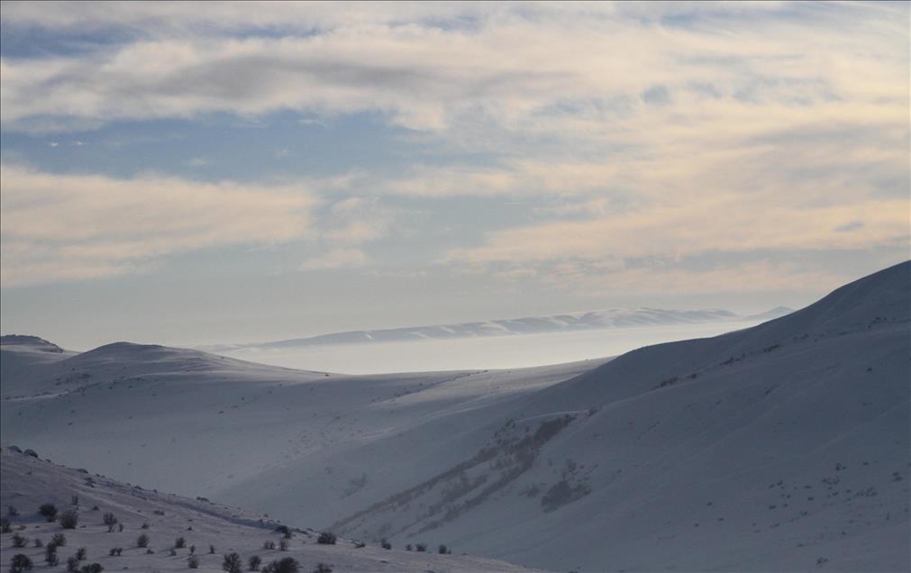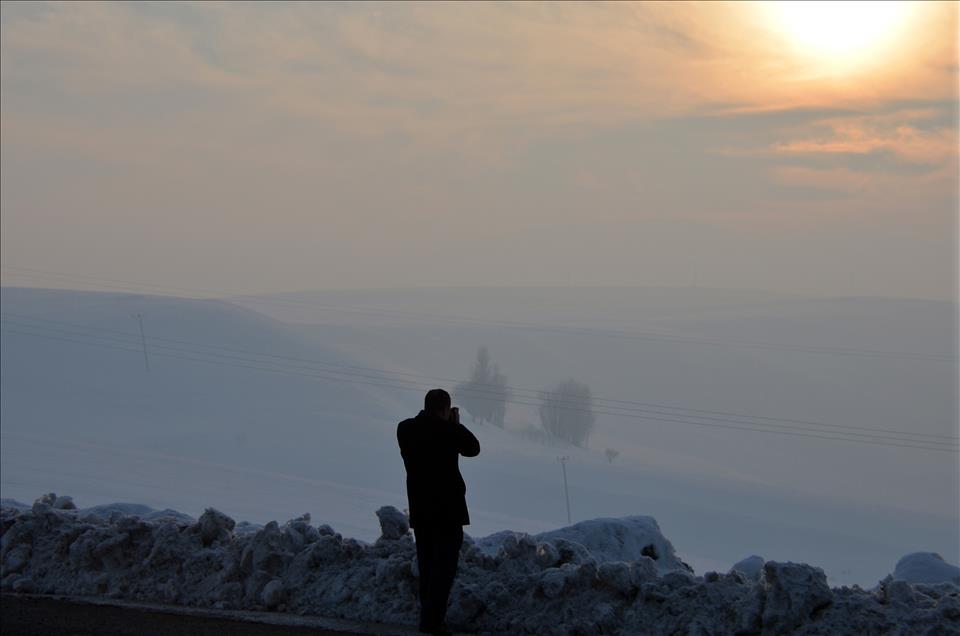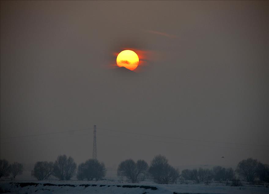 AGRI'DA ARALIKLARLA ETKISINI SURDUREN KAR YAGISI VE SOGUK HAVANIN ARDINDAN YUZUNU GOSTEREN GUNES, GUN BATIMINDA OLUSAN KIZILLIK ILE GUZEL GORUNTU OLUSTURDU. (ANADOLU AJANSI - CEMIL KARIP) (20121230)CEMIL KARIP