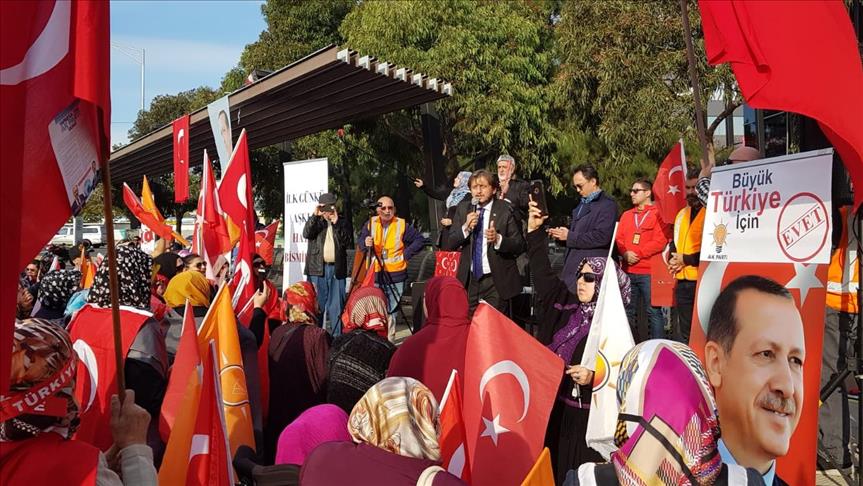 Ellerindeki Türk bayrakları ile araç konvoyu oluşturan ve meydanı dolduran kalabalığa hitap eden AK Parti Bursa Milletvekili Zekeriya Birkan, Avustralya makamlarına miting yapma hakkı tanıdıklarından dolayı teşekkür etti.