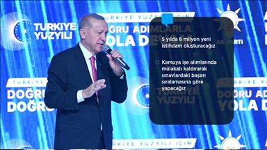 "Mesleki eğitim merkezlerinde çırak ve kalfa sayısını 2 milyona çıkartacağız. 5 milyon öğrencimize verilmekte olan ücretsiz öğle yemeği desteğini devlet okullarımıza yaygınlaştıracağız. Küresel gelişmeler ışığında sürekli güncelleme gerektiren eğitim alanında başarının kritik faktörü öğretmenlerimizdir. Tüm öğretmenlerimiz her yıl hizmet içi eğitime tabi tutulacaktır. Meslek liseleri başta olmak üzere eğitim kurumlarımızda patent, faydalı model, marka ve tasarım tescil sayısını sürekli artıracak ve her yıl tescil alınan ürünlerin en az yüzde 10'unun ticarileşmesini sağlayacağız.
