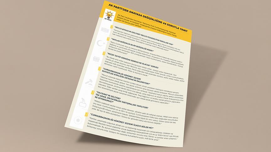 AK Parti adına MHP ile yapılan anayasa görüşmelerini yürüten partinin Genel Sekreteri Abdulhamit Gül'ün hazırladığı "Kararımız Evet Cumhurbaşkanlığı Hükümet Sistemi Sorular ve Cevaplar" kitapçığında anayasa değişikliğine ilişkin merak edilen 44 soruya yanıt veriliyor.