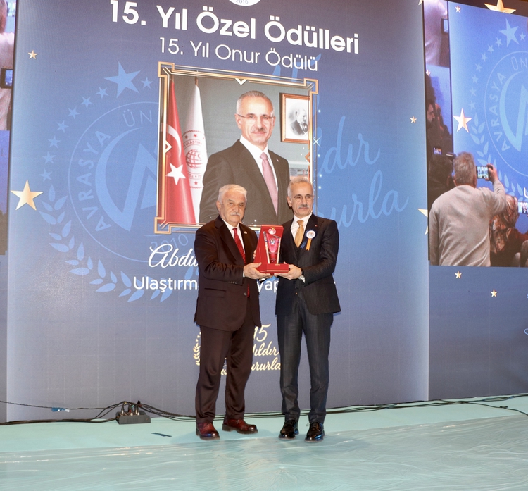 Konuşmaların ardından "15. Yıl Özel Ödülleri"nde Avrasya Üniversitesi Kurucusu ve Mütevelli Heyet Başkanı Ömer Yıldız, onur ödülünü Bakan Uraloğlu'na sundu.