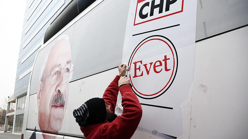Halk oylamasında "hayır" kampanyası yürütecek CHP, parti otobüslerinde önceki seçimlerde kullandığı "Önce İnsan, Önce Birlik, Önce Türkiye" sloganında yer alan oy pusulası üzerindeki "evet mührü" çıkartmalarını kaldırttı.
