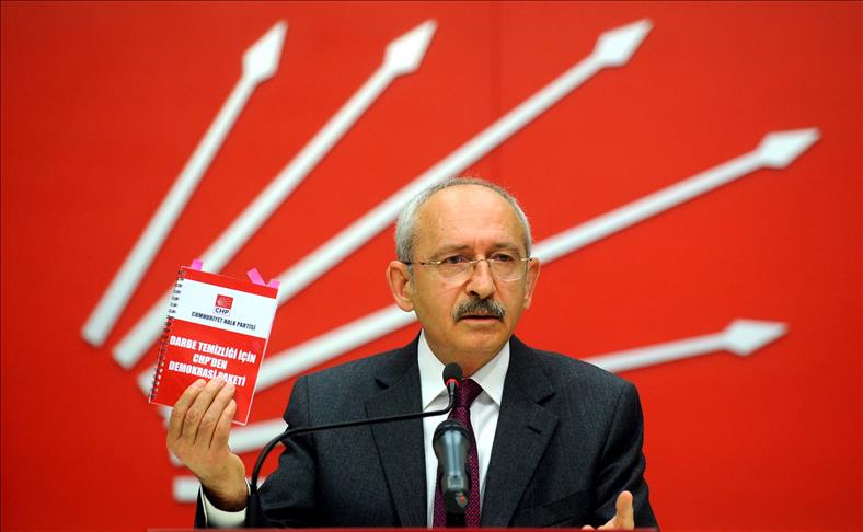 CHP Genel Başkanı Kemal Kılıçdaroğlu, partisinin genel merkezinde düzenlediği basın toplantısında, içinde CHP'nin yasal önerilerinin bulunduğu ''Darbe Temizliği İçin CHP'den Demokrasi Paketi'' kitapçığını basın mensuplarına tanıttı.