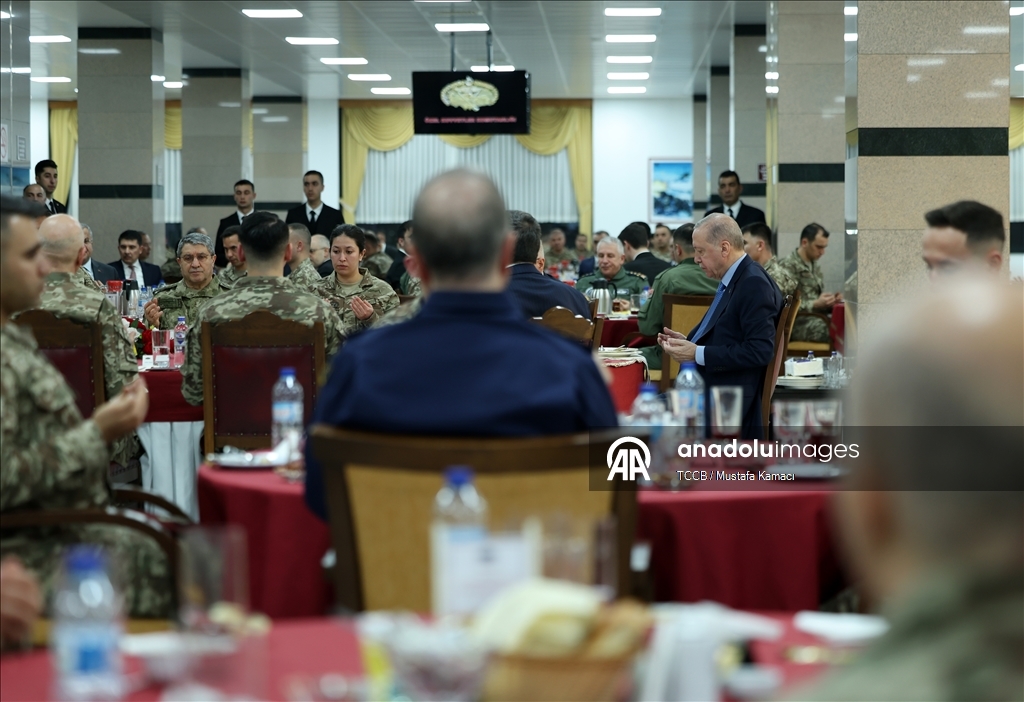 Erdoğan, "Rahmet kapılarının ardına kadar açıldığı bu mübarek ayda kahramanlar ocağının siz kahraman mensuplarıyla, Özel Kuvvetler Komutanlığımızın siz seçkin neferleriyle beraber olmaktan büyük bir memnuniyet duyuyorum. İftarınız mübarek olsun. Rabbim tuttuğunuz oruçları kabul eylesin." ifadelerini kullandı.