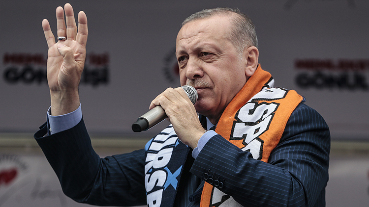 31 Mart'ta yapılacak seçimlere ilişkin değerlendirmede bulunan Erdoğan, "Ülkemizde bayrağa tahammülü olmayanlarla ezana tahammülü olmayanların ittifakıyla girdiğimiz bir seçim süreci yaşıyoruz. Bölücü örgütten emir alan partinin bayrağımıza tahammülsüzlüğünü mitinglerinden kongrelerine kadar bunları hep gördük mü, gördük." diye konuştu.