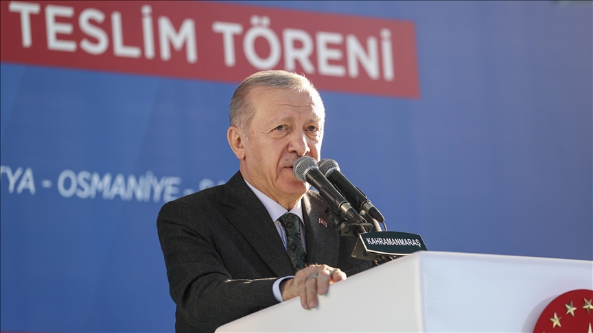 "Asrın felaketi" olarak nitelendirilen Kahramanmaraş merkezli 6 Şubat 2023'deki depremlerinin yaralarını hızla sarmak için gece gündüz demeden çalıştıklarını söyleyen Erdoğan, "Dağlar ne kadar yüksek ise yol onun üstünden geçer' inancıyla şehrimizi eskisinden daha güzel, daha dayanıklı ve modern hale getirmenin gayretindeyiz. Yıkımın büyüklüğü karşısında asla yılgınlığa kapılmadan asrın inşasını başlattık. O günden bugüne dek bir an olsun elimizi deprem bölgesinden çekmedik." diye konuştu.