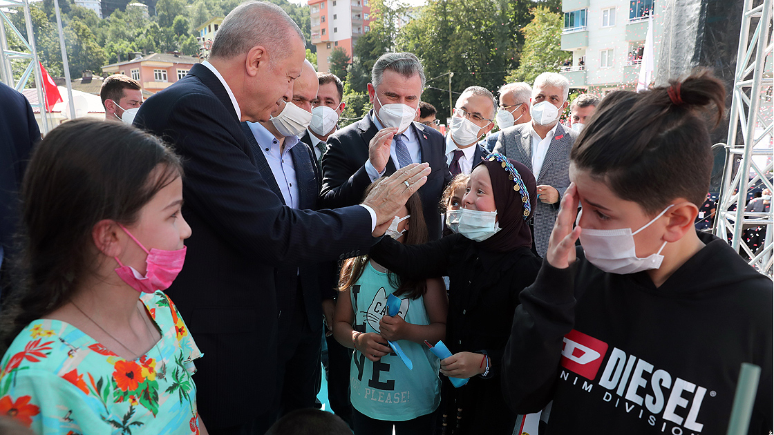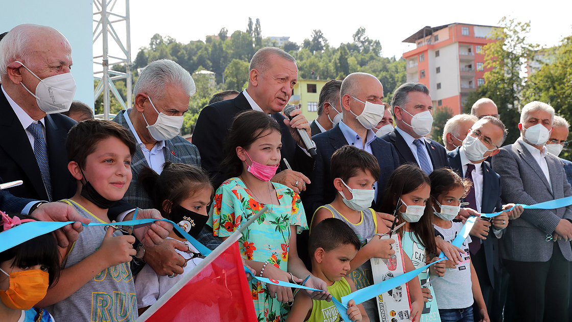 Sel ve toprak kaymasının çok yaşandığı Karadeniz'de yakın zamanda Rize'nin de bu tür afetlerle karşılaştığını aktaran Erdoğan, "Antalya ve Muğla gibi orman yangınlarının, Kastamonu ve Sinop gibi sellerin ciddi tahribata, can ve mal kaybına yol açtığı yerlerde de yaraları sarıyoruz. İnşallah yakında bu bölgelere tekrar gelip çalışmaları yerinde göreceğim." ifadesini kullandı.