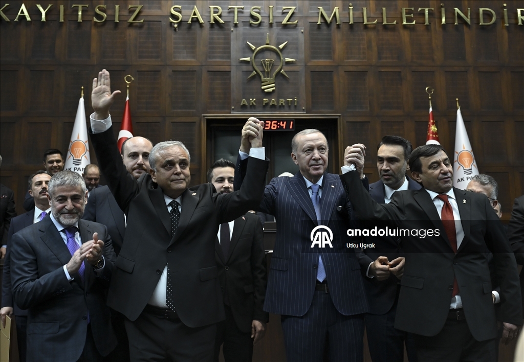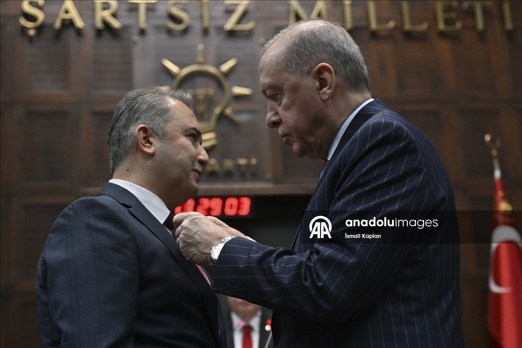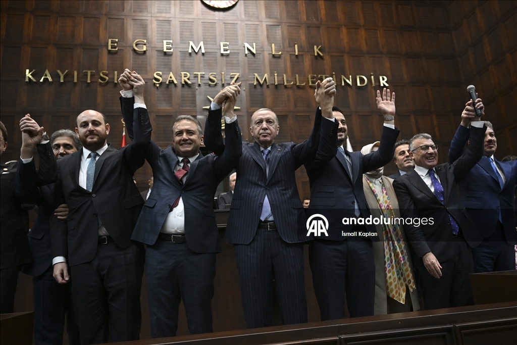 Cumhurbaşkanı Erdoğan'ın konuşmasının ardından AK Parti'ye katılan, Mersin Milletvekili Hasan Ufuk Çakır, Kahramanmaraş Milletvekili İrfan Karatutlu ve İstanbul Milletvekili İsa Mesih Şahin'e rozetlerini taktı.