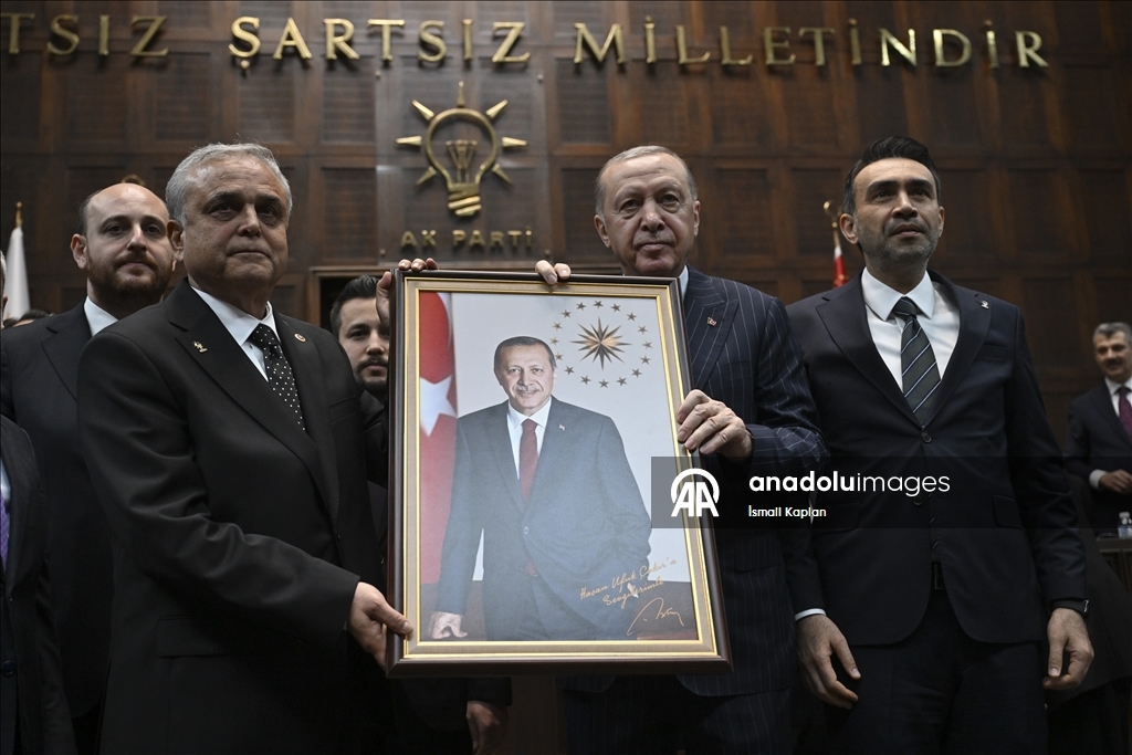 Cumhurbaşkanı Erdoğan, partisinin rozetini taktığı isimlere imzalı fotoğrafını hediye etti.