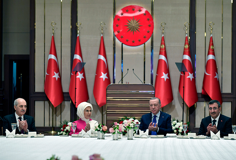 "İçinde bulunduğumuz asrı Türkiye Yüzyılı yapmak için incelikle örülmüş çok boyutlu bir politikayı adım adım hayata geçiriyoruz. Bu mücadelede ülkemizin dış ilişkilerinin icrasında merkezi bir konuma sahip olan hariciye teşkilatımıza tabiatıyla büyük sorumluluk düşüyor. Ekonomisi, ihracatı, turizmi, savunma sanayisi ve elbette uluslararası itibarıyla Türkiye büyüdükçe Türkiye'nin küresel siyasetteki önemi ve ağırlığı arttıkça sizin mesainiz de yoğunlaşıyor. Genişleyen diplomatik temsilcilik ağımızla, 264 dış temsilciliğimizle bugün şanlı bayrağımızı dünyanın dört bir yanında gururla dalgalandırıyoruz. Şunu bir defa altını çizerek ifade etmek durumundayım. Ne eksen kayması ne rota değişimi ne de köklerden kopma, dış siyasetimizde bunların hiçbirisi söz konusu değildir ve olamaz."
