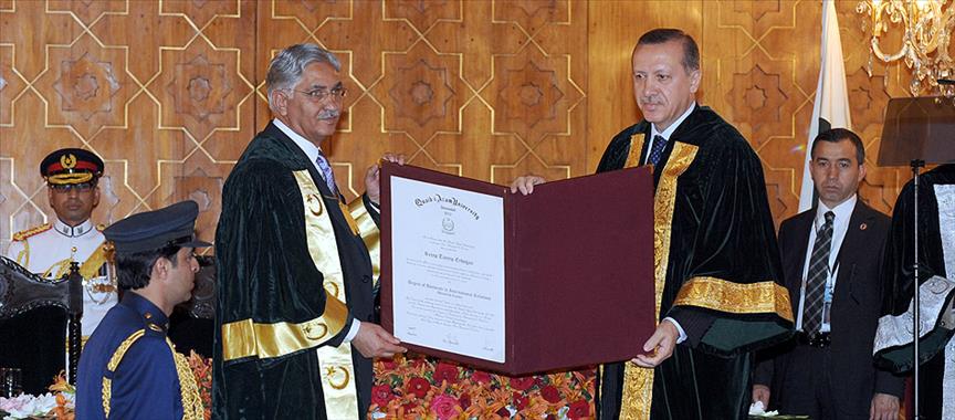 Öte yandan, İslamabad'daki Kaid-i Azam Üniversitesi Uluslararası İlişkiler Bölümü; liderliği, İslam dünyasında üstlendiği rol ve evrensel barış için gösterdiği çabalar için Erdoğan'a Fahri Doktora unvanı verdi.