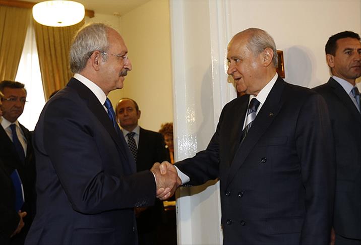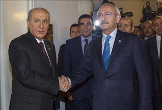 Bahçeli'nin Meclis'teki makamında saat 13.00'te başlayan görüşmeye, CHP'den Genel Sekreter Gürsel Tekin, Grup Başkanvekilleri Akif Hamzaçebi ve Engin Altay ile Genel Başkan Yardımcısı Erdoğan Toprak, MHP'den ise Grup Başkanvekili Oktay Vural, Genel Sekreter İsmet Büyükataman ile Genel Başkan Yardımcısı Semih Yalçın da katılıyor.