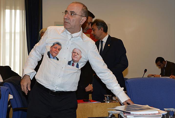 CHP İstanbul Milletvekili Mevlüt Aslanoğlu, partisinin tutuklu milletvekilleri Mustafa Balbay ve Mehmet Haberal'ın fotoğraf baskısının yer aldığı gömlekle komisyona geldi.