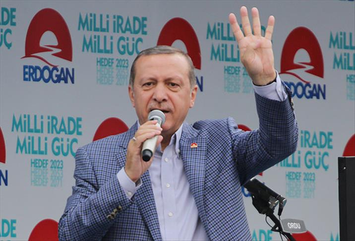 "Ordu, yeni Türkiye’ye evet mi? Ordu, büyük Türkiye’ye evet mi? Ordu güçlü Türkiye’ye evet mi? 2023 hedeflerine evet mi Ordu? Eski Türkiye’nin kapılarını kapatıyor muyuz? Yeni Türkiye’nin kapılarını açıyor muyuz Ordu? Milletin adayını cumhurbaşkanlığına taşıyor muyuz Ordu? Kim o aday?" diye alandakilere sorular yönelten Erdoğan, vatandaşların, "Recep Tayyip Erdoğan" diye yanıt vermesi üzerine, "Maşallah, maşallah. Ordu’da evelallah bu iş bitmiştir. Ordu 'tamam inşallah' diyor" şeklinde konuştu.