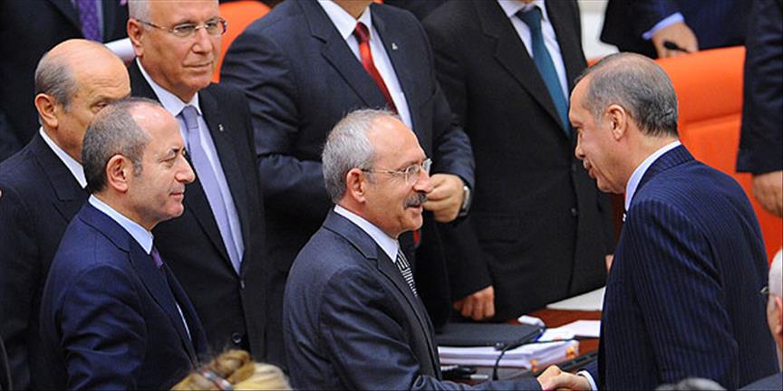 Erdoğan, CHP Genel Başkanı Kemal Kılıçdaroğlu, MHP Genel Başkanı Devlet Bahçeli, CHP Grup Başkanvekili Akif Hamzaçebi, MHP Grup Başkanvekilleri Oktay Vural ve Mehmet Şandır, BDP Grup Başkanvekilleri Pervin Buldan ve Hasip Kaplan, TBMM İdari Amiri, BDP Muş Milletvekili Sırrı Sakık ile ön sıralarda bulunan bazı muhalefet partisi milletvekilleri ile tokalaştı.